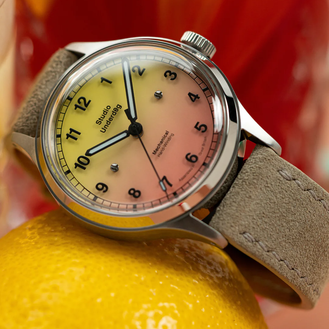 L’idea è stata quindi quella di creare un orologio che rispettasse queste caratteristiche storiche con una forte rivisitazione in chiave moderna e in perfetto stile Underd0g. L’orologio viene proposto in 4 varianti: Pink Lem0nade, Steffany Blue, Full Mo0n e Midnight. In tutte le configurazioni è presente, tra il quadrate e il vetro bombato in zaffiro, un disco trasparente (anch’esso in vetro zaffiro) fissato con due viti a vista. Su di esso sono stampati gli indici in numeri arabi e il marchio, che sembrano quasi fluttuare.