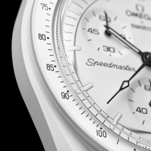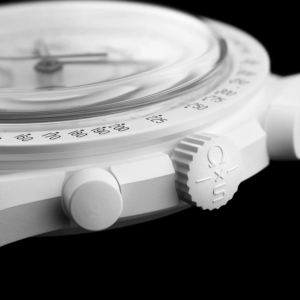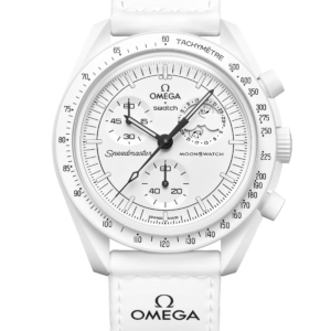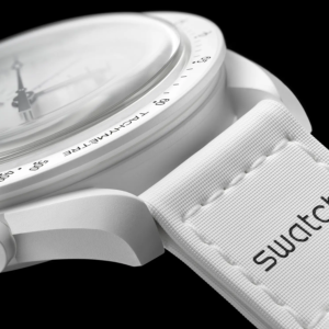 Se all’apparenza il nuovo MoonSwatch Mission to the Moonphase potrebbe sembrare semplicemente una variazione cromatica dei precedenti modelli, in realtà presenta una differenza sostanziale a livello di funzionalità. Il contatore dei decimi di secondo a ore 2 ha ceduto il posto ad un indicatore di fasi lunari. Questa è una complicazione inedita per Swatch, certamente affascinante, resa ancora più particolare dall’immagine di Snoopy. La colorazione bianca di questo modello prende spunto dalla luna piena.
