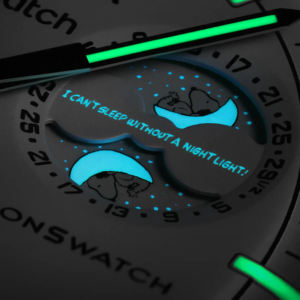 Il legame tra Snoopy e la NASA nacque a partire dal 1968 e addirittura il Modulo Lunare della missione Apollo X fu soprannominato proprio come il simpatico beagle dei Peanuts. Omega ha più volte omaggiato la storia del Silver Snoopy Award, un riconoscimento ottenuto dal marchio svizzero per il ruolo determinante del Moonwatch durante il rientro della sfortunata missione Apollo XIII. Su questo nuovo MoonSwatch Mission to the Moonphase, Snoopy compare all’interno del quadrante in uno dei contatori e poi, sul coperchio che chiude il vano per la pila, è raffigurata la sua impronta sulla superficie lunare.