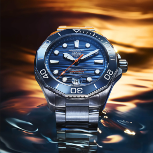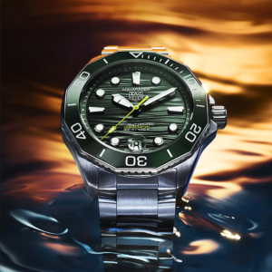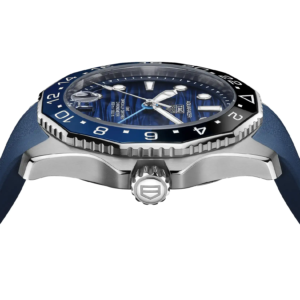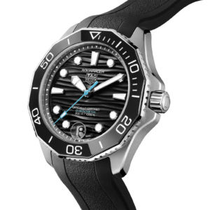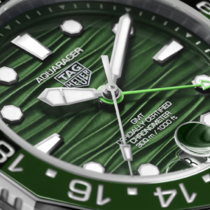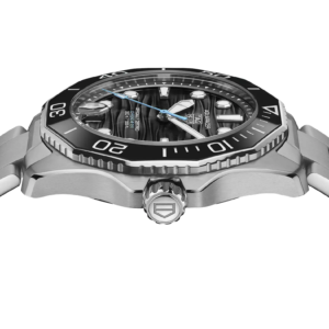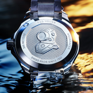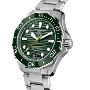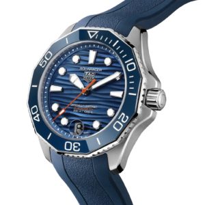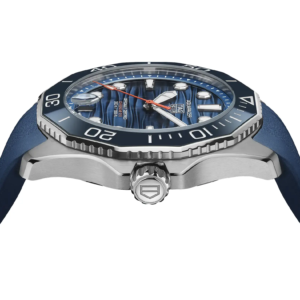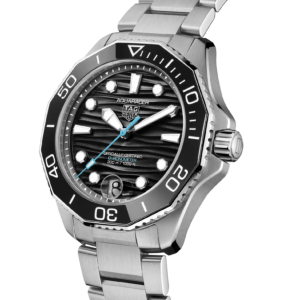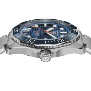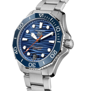 L’altra modifica sostanziale, ancora più evidente fin dal primo colpo d’occhio, riguarda i quadranti. Al posto dei solchi orizzontali, adottati a partire dal 2021, c’è ora un motivo tridimensionale a onde che dà forte personalità a questi diver. Gli indici applicati hanno cornici ottagonali che riprendono la spigolosità tipica della ghiera dell’Aquaracer, mentre la sfera delle ora ha un design lievemente rivisto che trae spunto dallo scudo di Tag. Il vetro è uno zaffiro con trattamento antiriflesso su entrambi i lati e, in corrispondenza della finestra della data, è applicata una lente magnificatrice sul lato interno.
