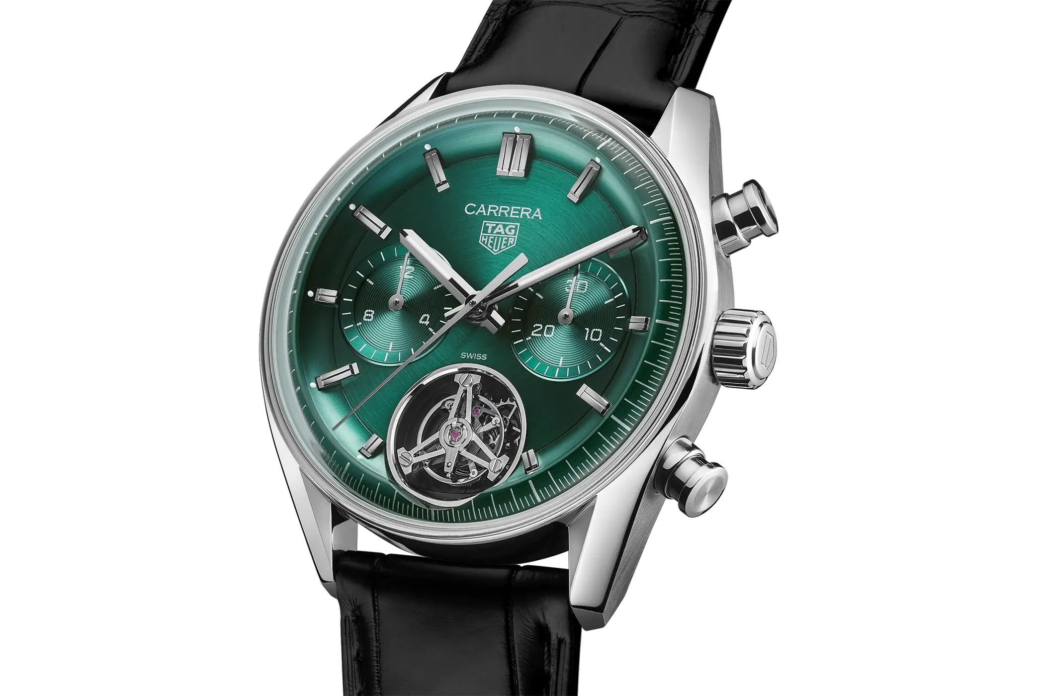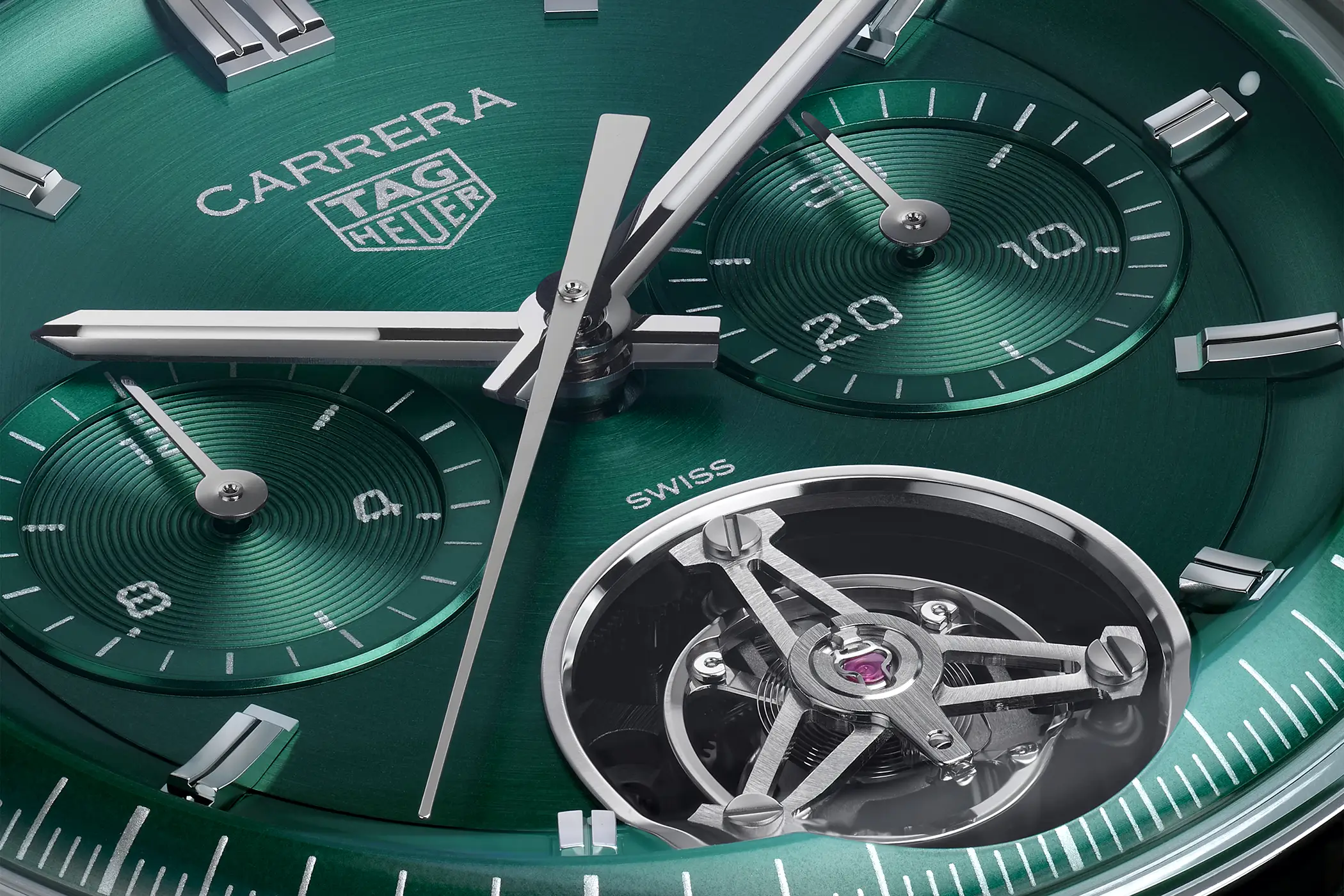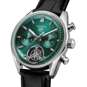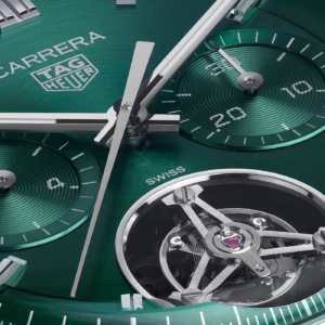 Tag Heuer ha presentato poi anche un nuovo Carrera Tourbillon, sostanzialmente identico alla Ref: CBS5010.FC6543 introdotta nel 2023, ma con il quadrante nella stessa colorazione verde del Carrera Dato. Anche in questo caso la cassa è la “Glassbox”, qui nella variante più grande da 42mm di diametro. Il calibro è il TH20-09 che, rispetto alla meccanica base si distingue proprio per il tourbillon posizionato a 6 e racchiuso da una cornice di vetro.
