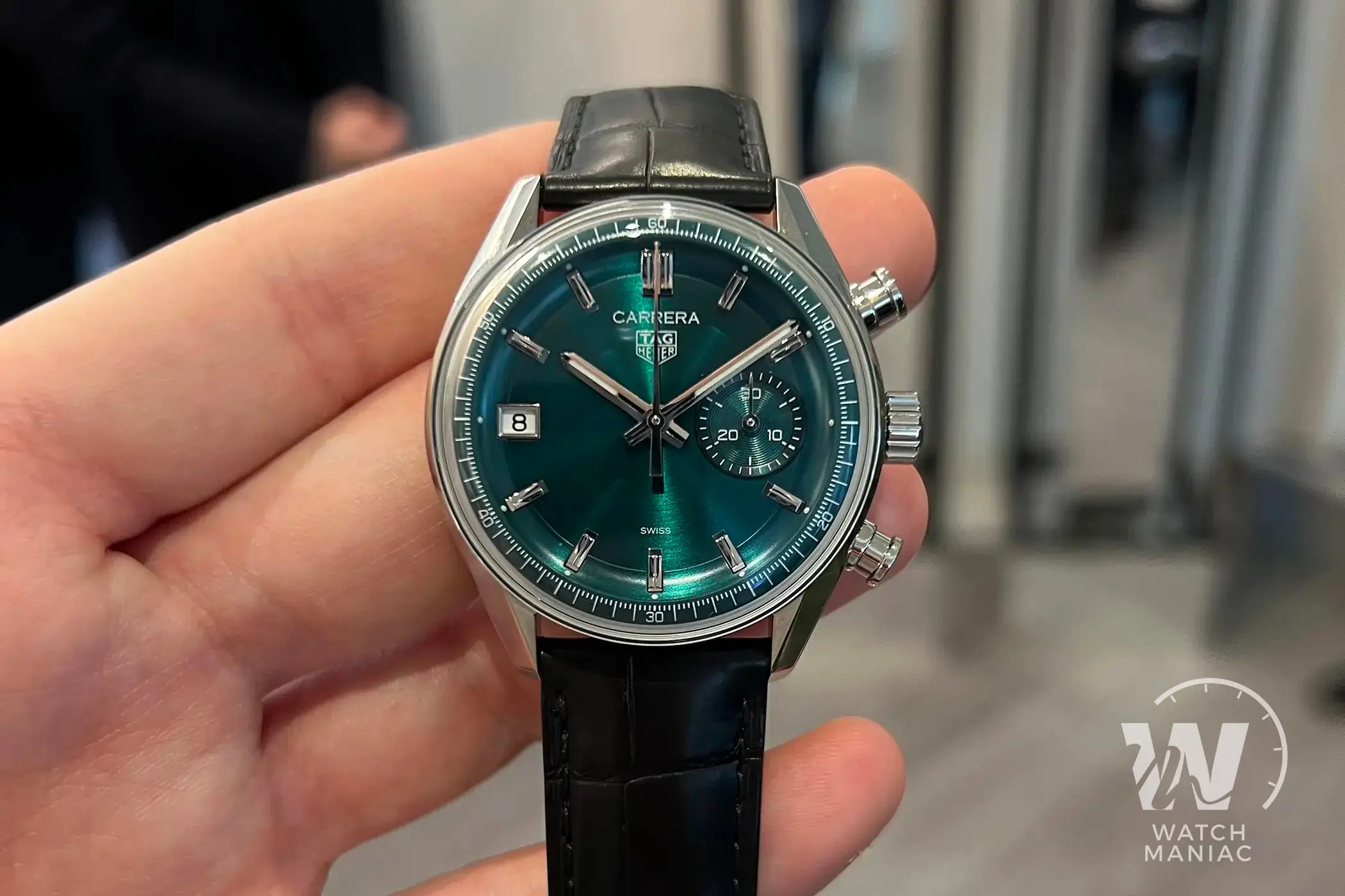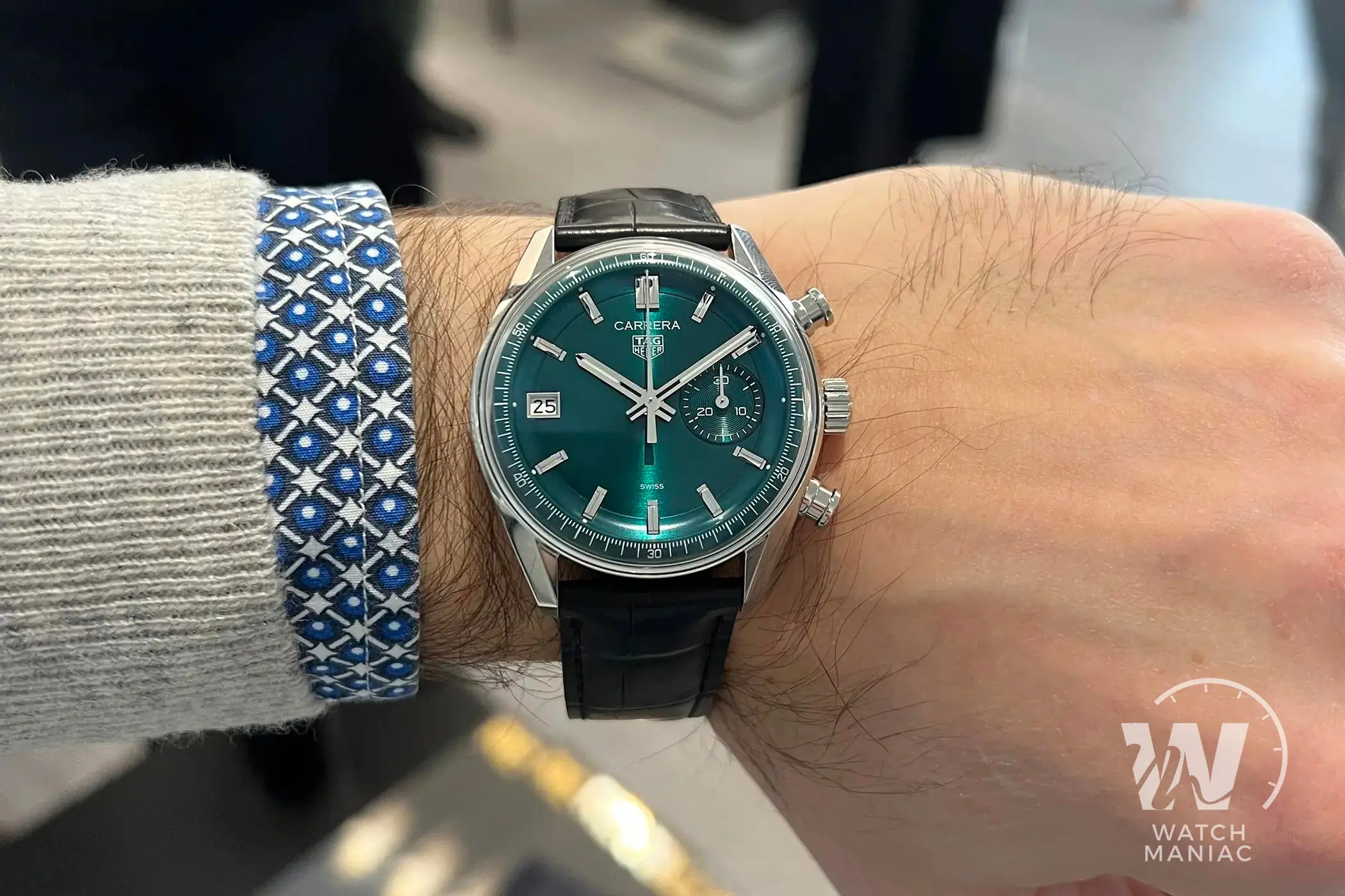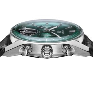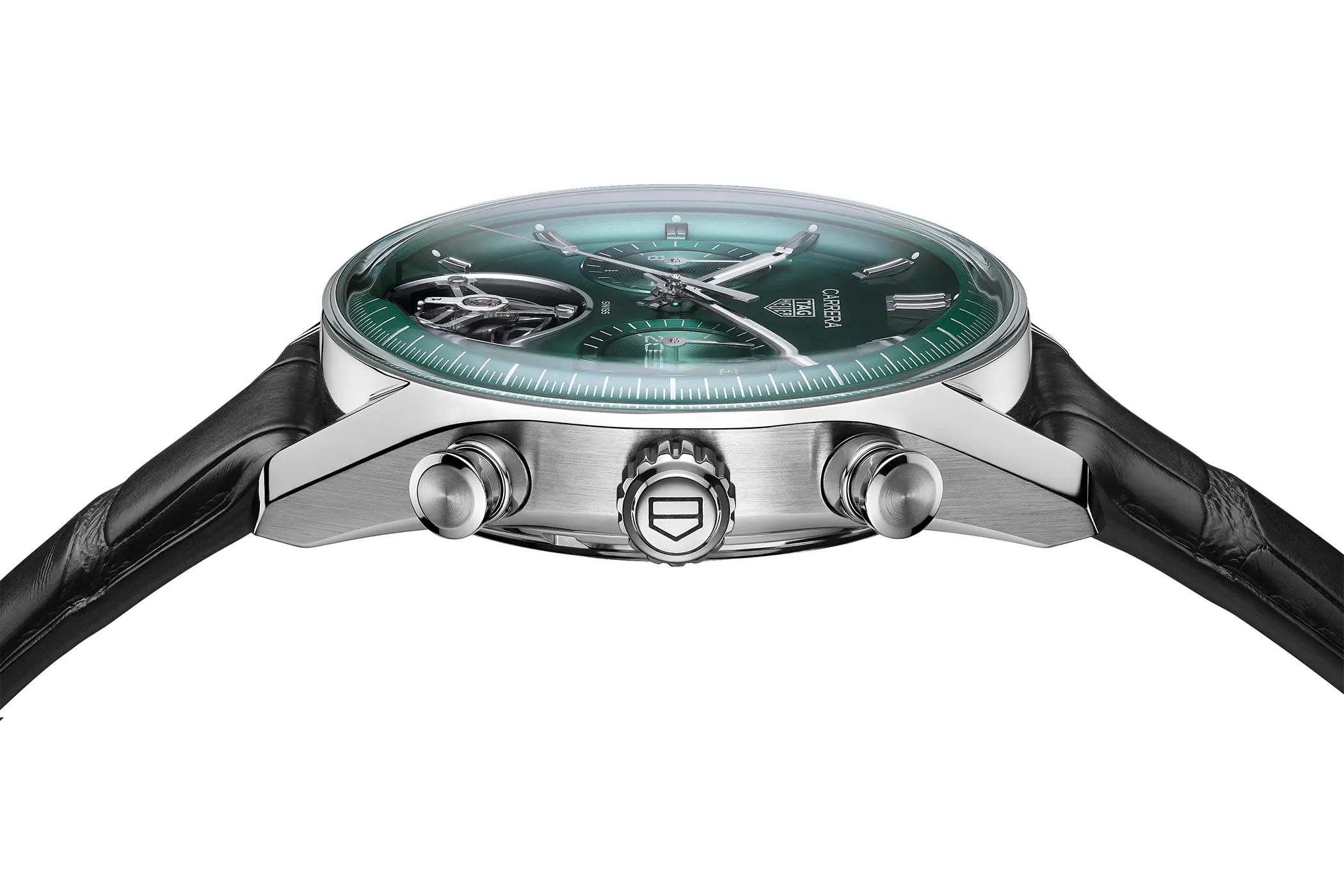 Tag Heuer ha presentato poi anche un nuovo Carrera Tourbillon, sostanzialmente identico alla Ref: CBS5010.FC6543 introdotta nel 2023, ma con il quadrante nella stessa colorazione verde del Carrera Dato. Anche in questo caso la cassa è la “Glassbox”, qui nella variante più grande da 42mm di diametro. Il calibro è il TH20-09 che, rispetto alla meccanica base si distingue proprio per il tourbillon posizionato a 6 e racchiuso da una cornice di vetro.