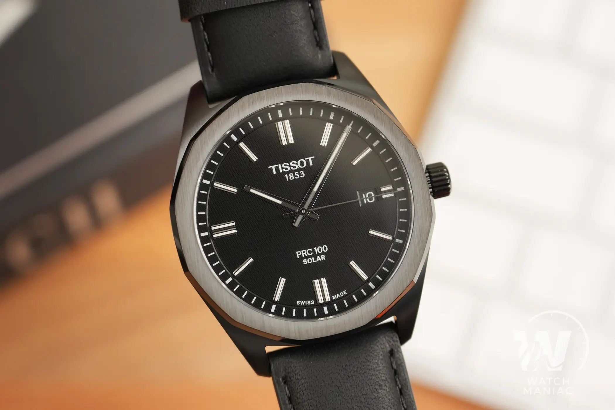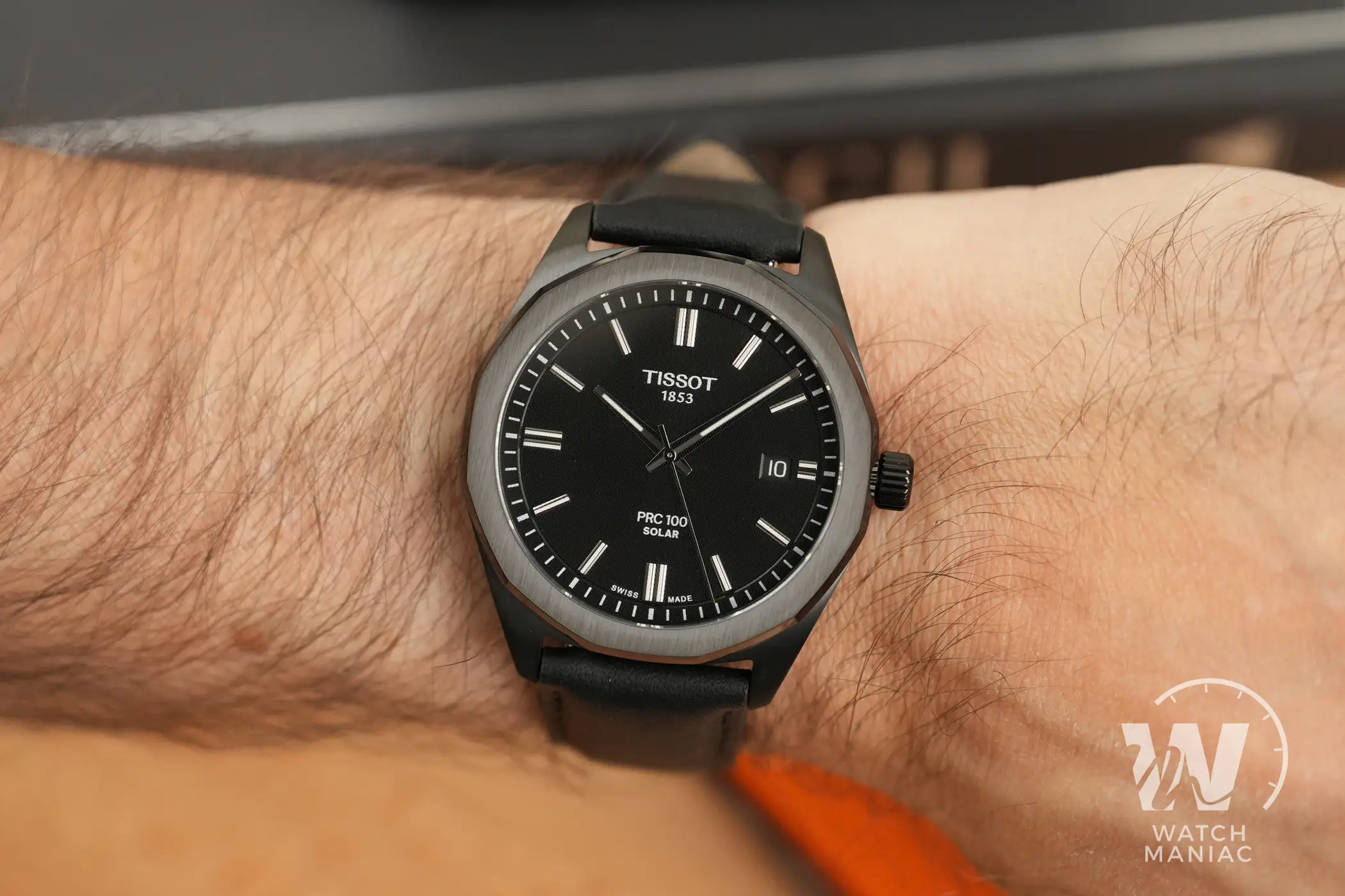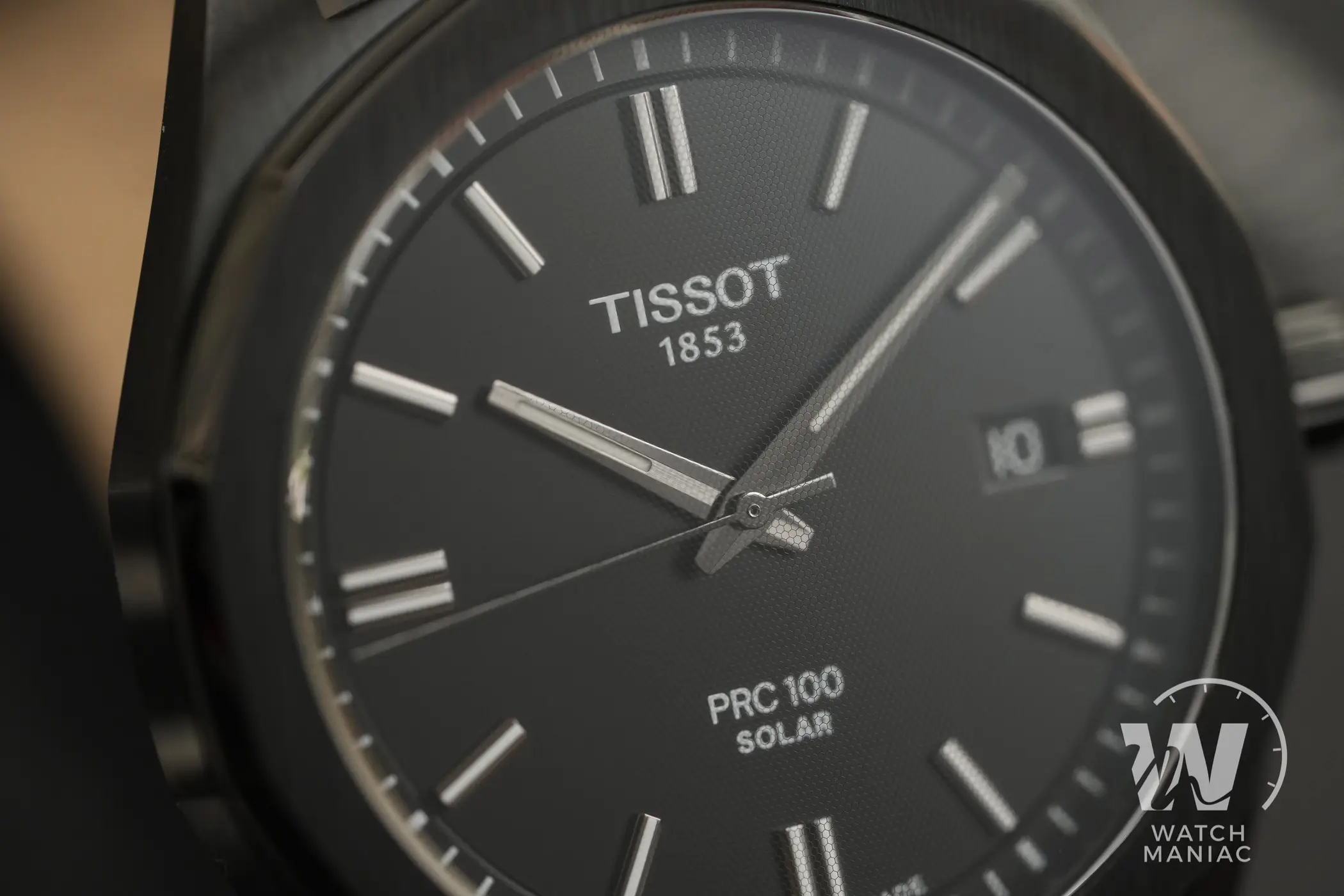 Al momento sono state presentate 5 referenze del Tissot PRC 100 Solar, con una scelta di 3 quadranti abbinati a bracciali in acciaio o cinturini in pelle. In questa recensione potete vedere la variante con cassa rivestita in PVD nero. Il quadrante nero ha una finitura opaca con scritte ridotte al minimo ed è pensato per la miglior leggibilità possibile. In questa versione scura la data a ore 3 non è esageratamente evidente, grazie all’adozione di un disco nero.