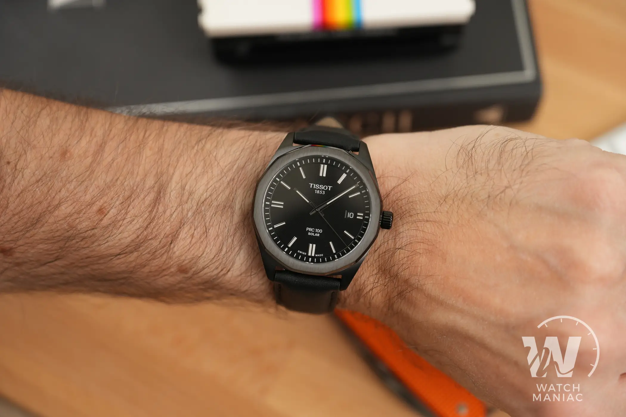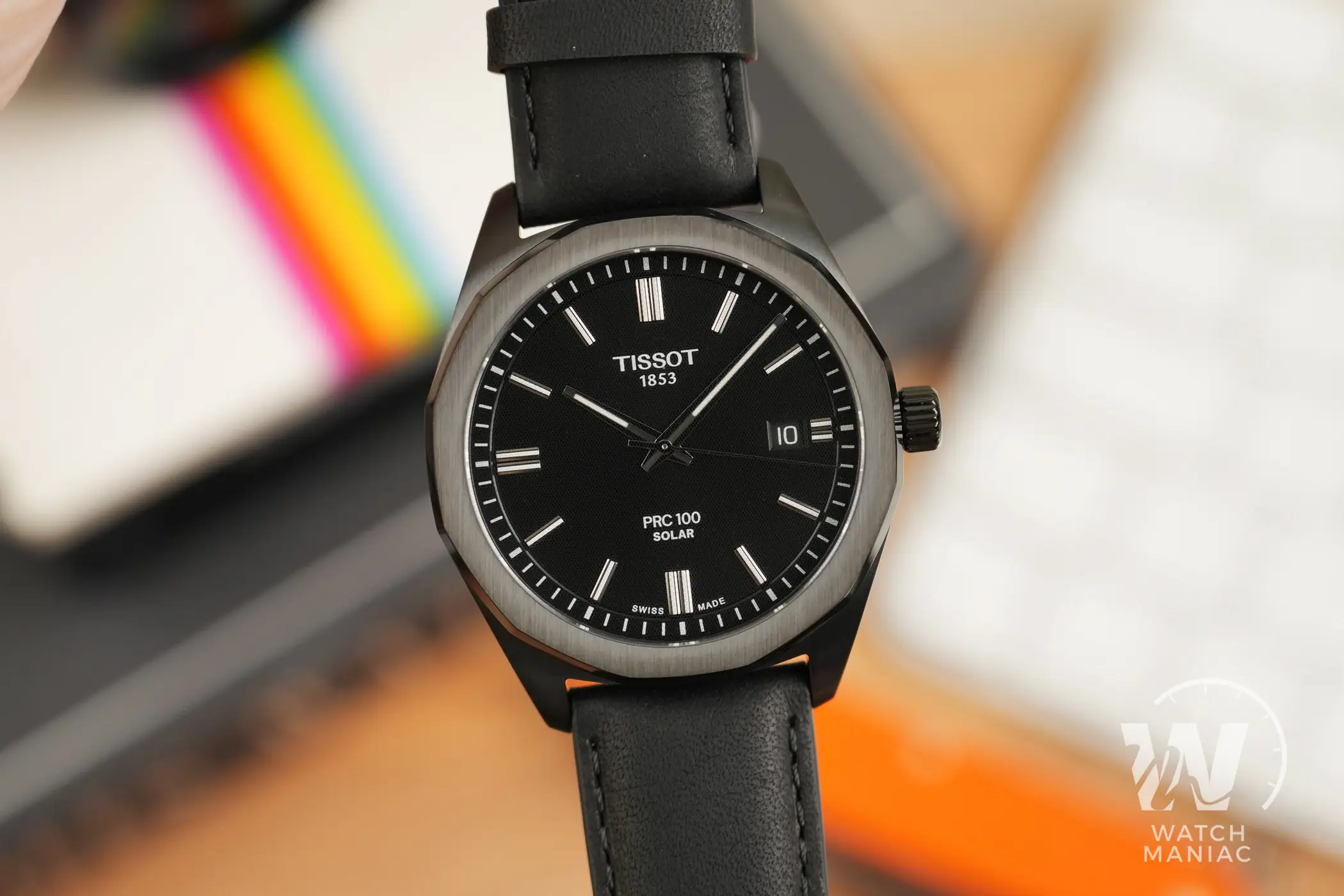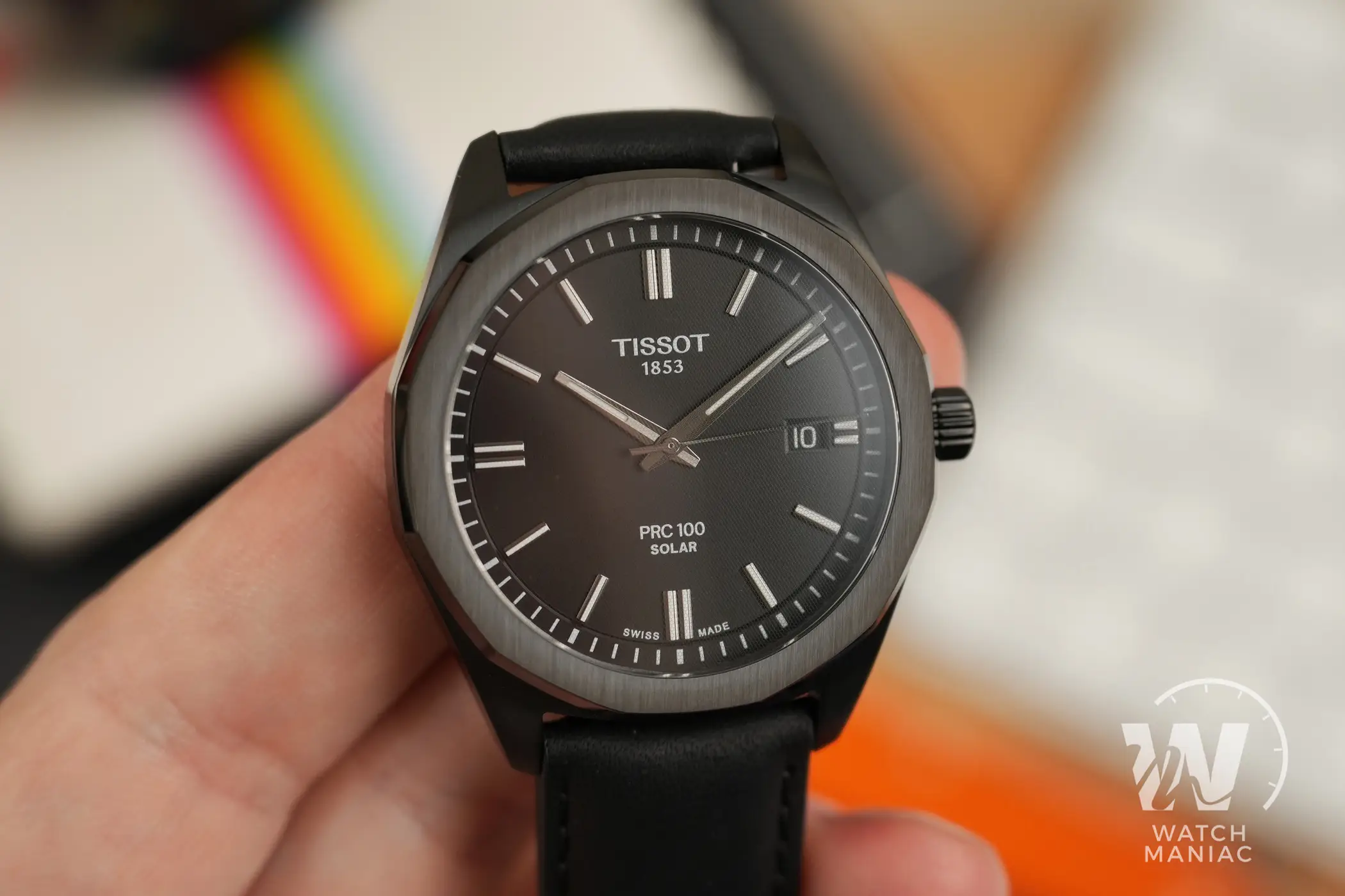 Al momento sono state presentate 5 referenze del Tissot PRC 100 Solar, con una scelta di 3 quadranti abbinati a bracciali in acciaio o cinturini in pelle. In questa recensione potete vedere la variante con cassa rivestita in PVD nero. Il quadrante nero ha una finitura opaca con scritte ridotte al minimo ed è pensato per la miglior leggibilità possibile. In questa versione scura la data a ore 3 non è esageratamente evidente, grazie all’adozione di un disco nero.