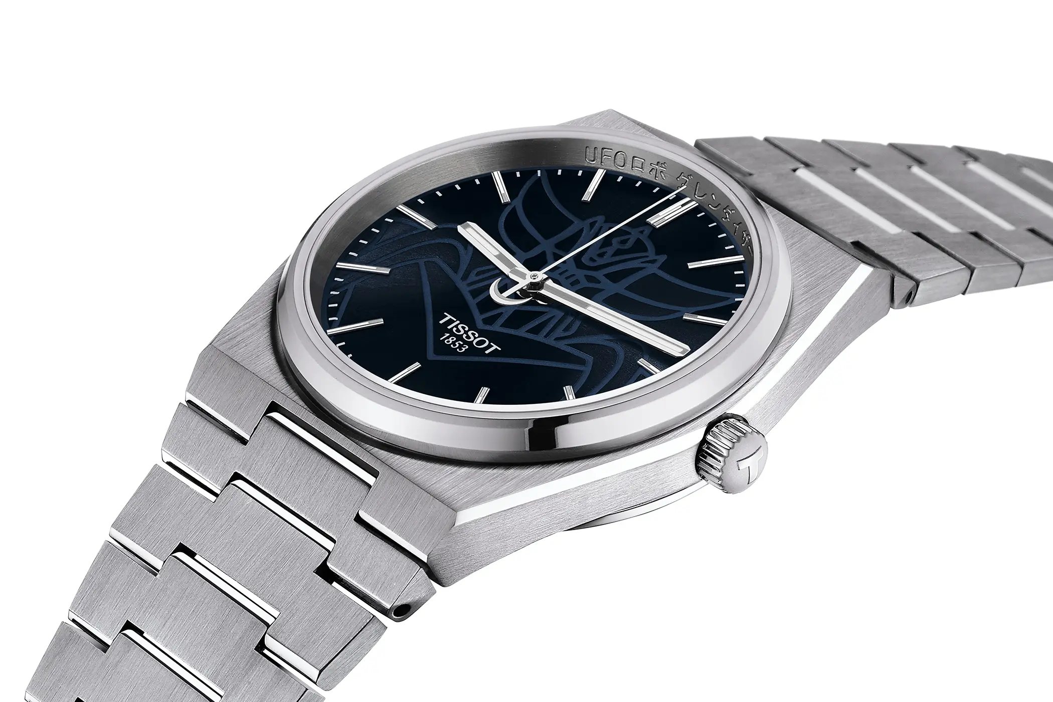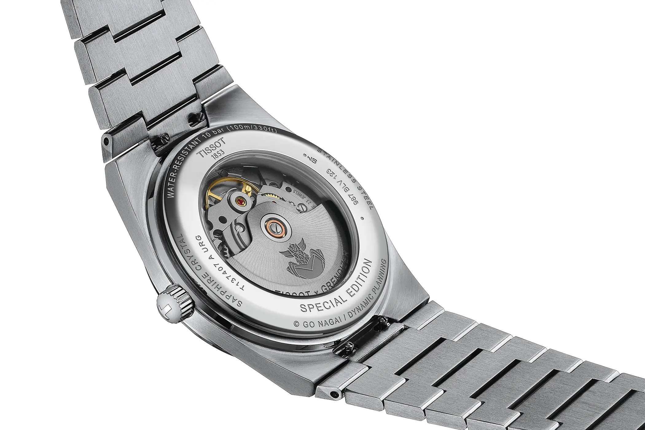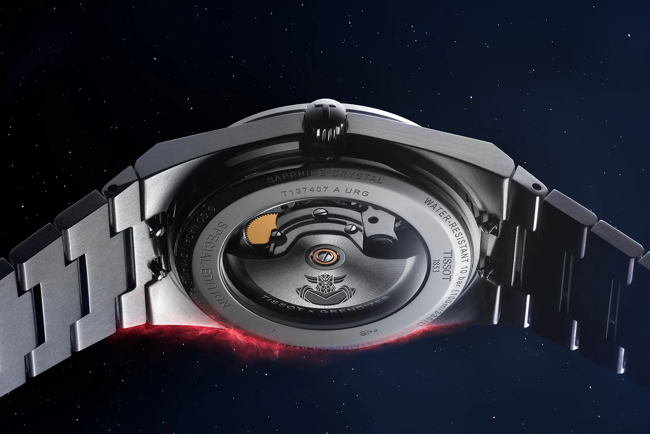 Il PRX UFO Robot Grendizer Special Edition si distingue dalle altre referenze del PRX per alcuni dettagli unici. Il blu scelto per il quadrante si ispira proprio al colore di Goldrake. La rappresentazione del robot giapponese è realizzata tono su tono e risalta soprattutto al buio grazie alla luminescenza della Superluminova. La lancetta dei secondi ha un contrappeso che replica le forme dell’alabarda spaziale di UFO Robot e sul lato interno della lunetta in acciaio è incisa la scritta “UFO ロボ グレンダイザー”, il titolo originale di Goldrake in giapponese. Il movimento, che è il ben noto Powermatic 80 di Tissot con spirale del bilanciere in Nivachron e 80 ore di riserva di carica, presenta una massa oscillante personalizzata con la sagoma di Goldrake incisa al laser.