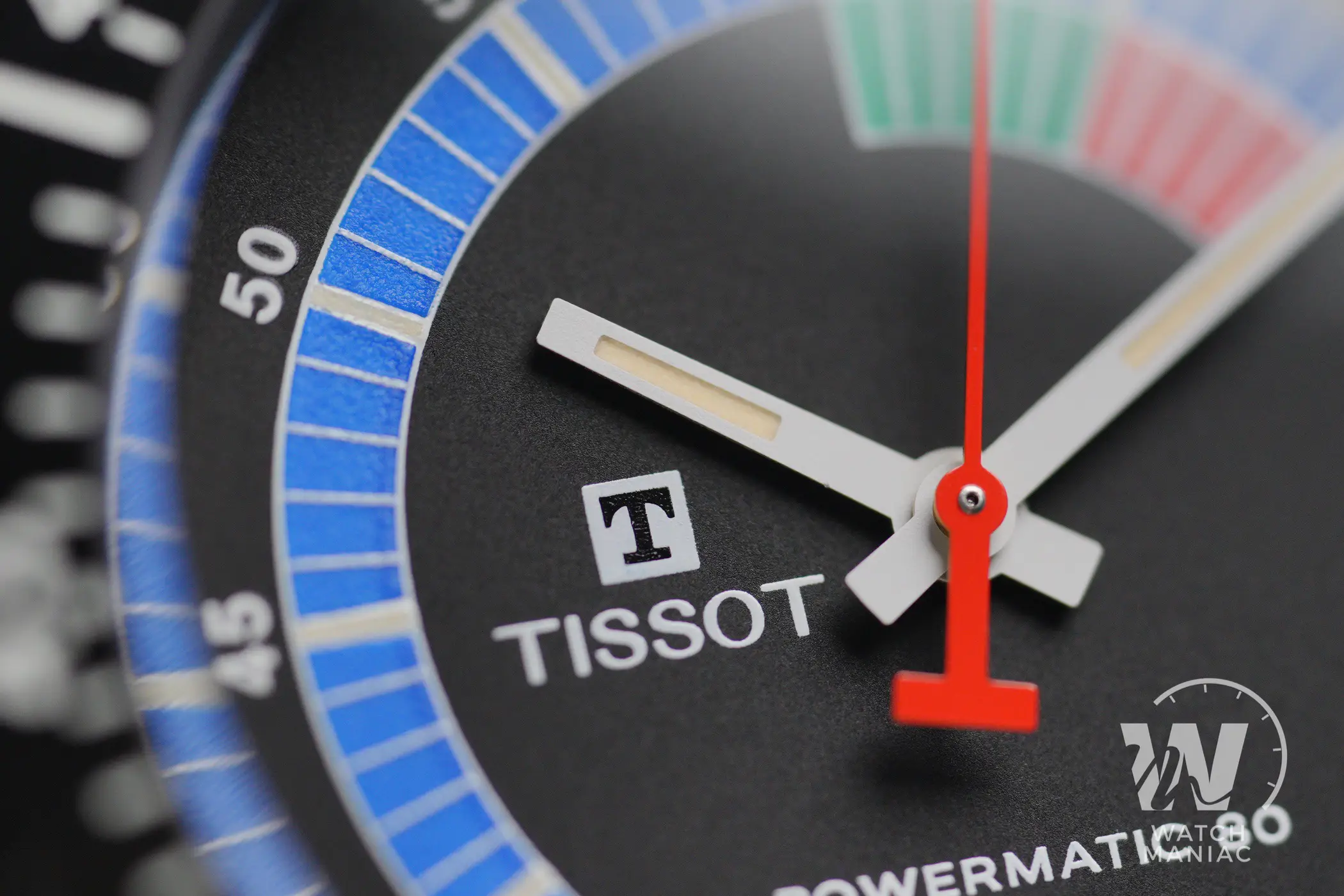 I quadranti richiamano i colori della versione scelta, quindi in questo caso l’anello con la minuteria è principalmente in blu. Il verde e il rosso vengono usati per i primi due settori da 5 minuti ciascuno, che possono essere usati per il conto alla rovescia nelle regate. Questo è un dettaglio ripreso direttamente dal Sideral S del 1971, così come il logo di Tissot in posizione asimmetrica a ore 9. Manca invece la denominazione del modello a destra, mentre la scritta automatic è stata sostituita da Powermatic 80. Resta confermata, invece, la finestra della data a ore 3 con disco a sfondo bianco. Le sfere di ore e minuti sono a bastone e sono verniciate di bianco, mentre la lancetta dei secondi è rossa e ha un bel contrappeso a forma di T.