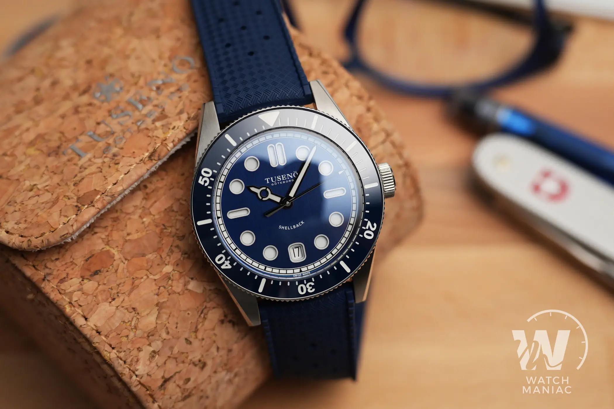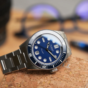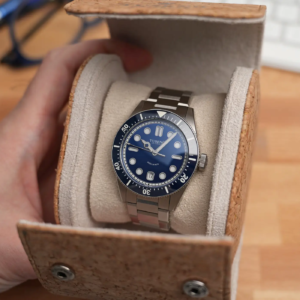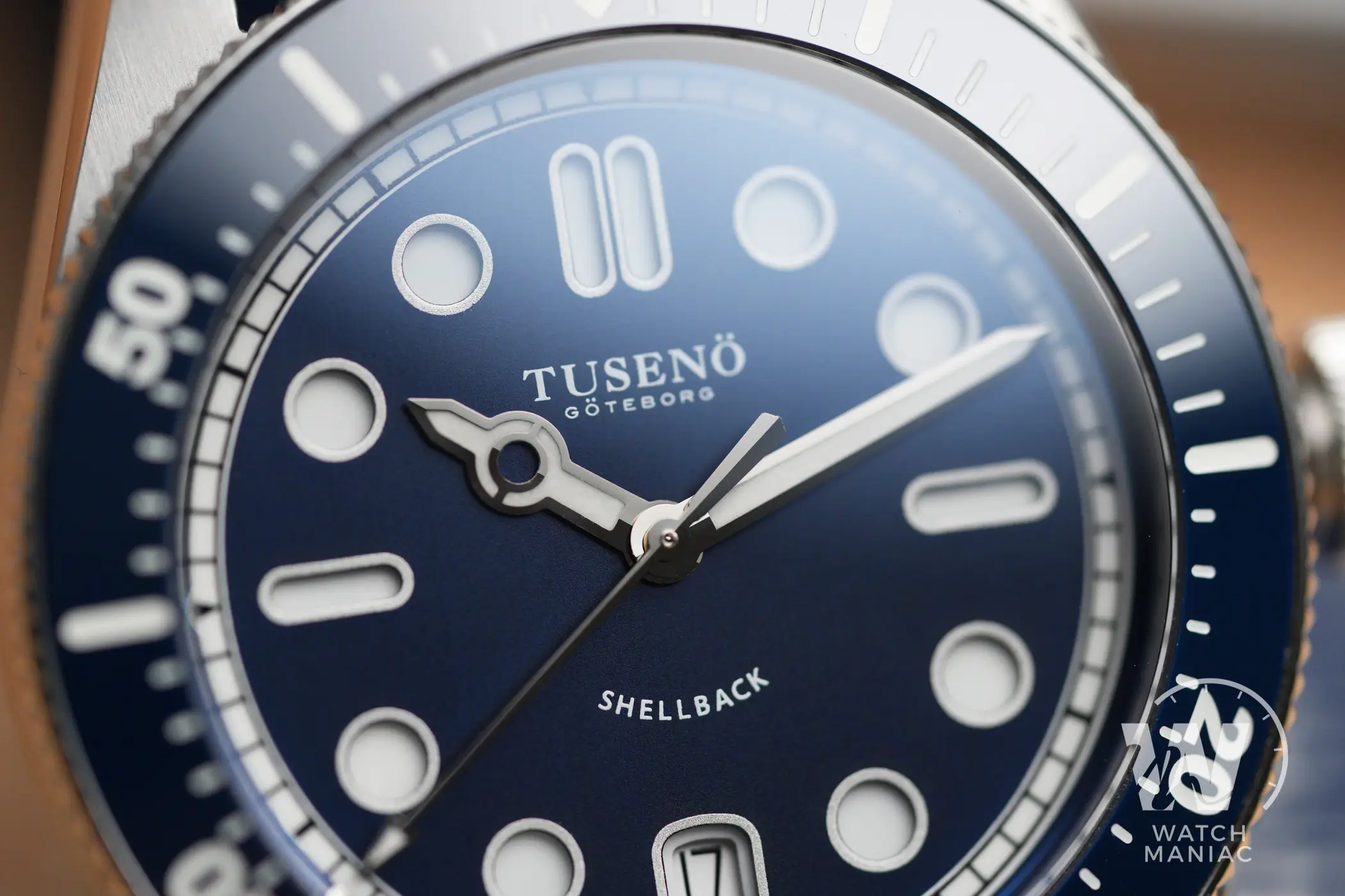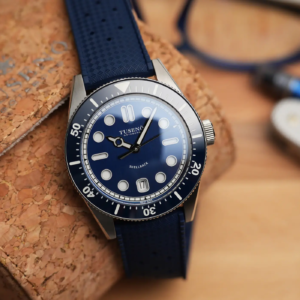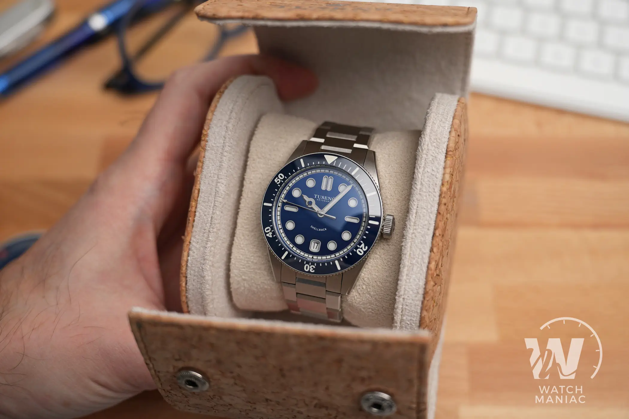 La confezione è molto compatta e all’interno della controscatola in cartone nero si trovano un panno in microfibra marchiato, uno sticker e l’astuccio da viaggio rivestito in sughero. Il Tusenö Shellback V2 è disponibile in 4 varianti, compresa anche una configurazione tutta nera con rivestimento DLC. In fase di acquisto è poi possibile scegliere tra versione con data o senza. Il quadrante blu della versione recensita è l’unico ad avere una finitura spazzolata verticale. Questa crea un effetto cangiante che fa passare il quadrante dal nero al blu elettrico intenso a seconda dell’inclinazione della luce.
