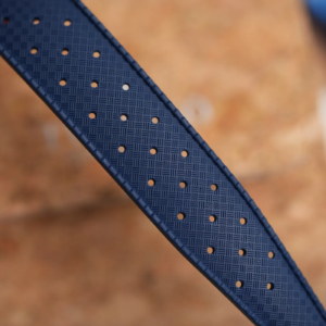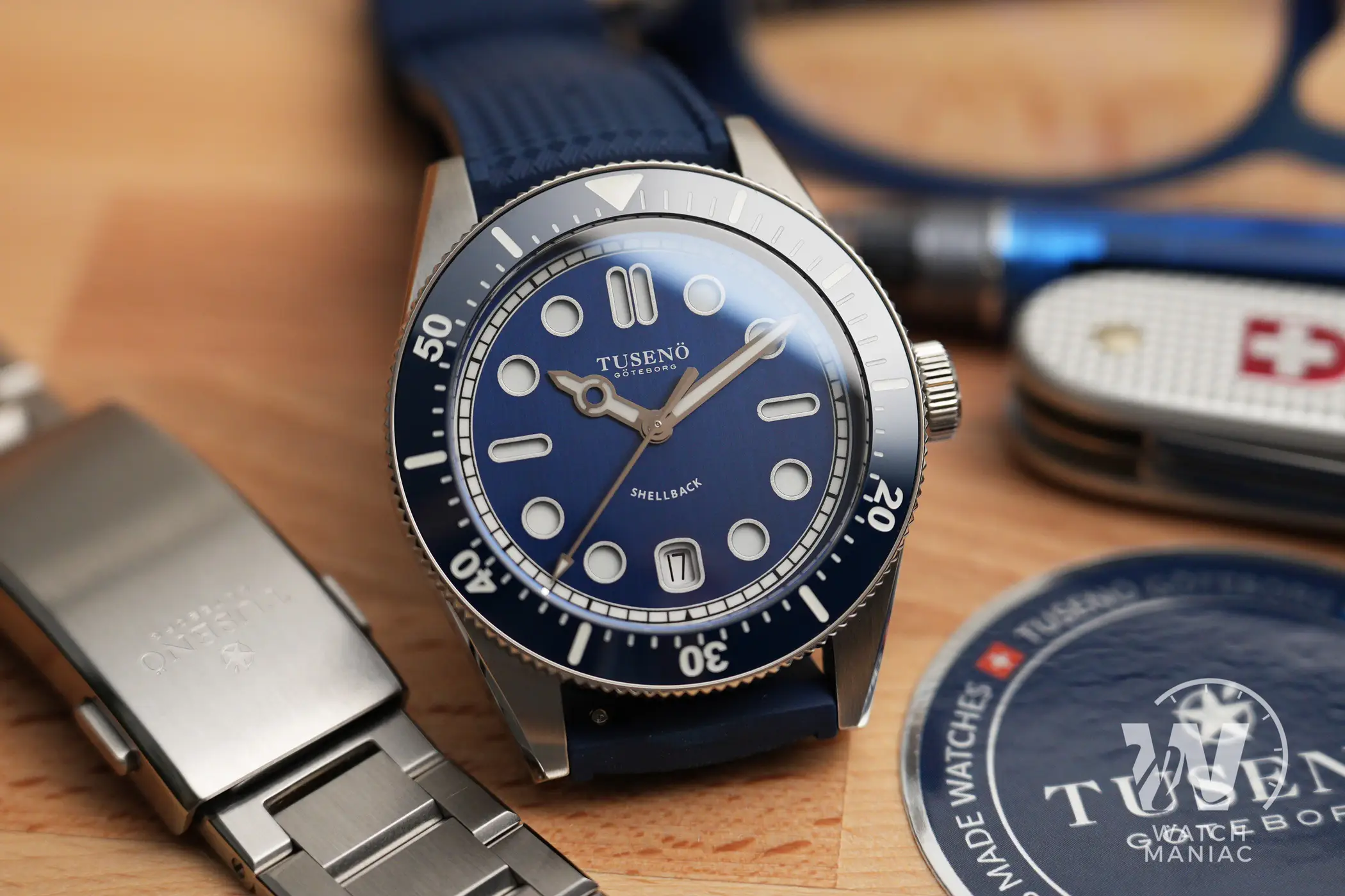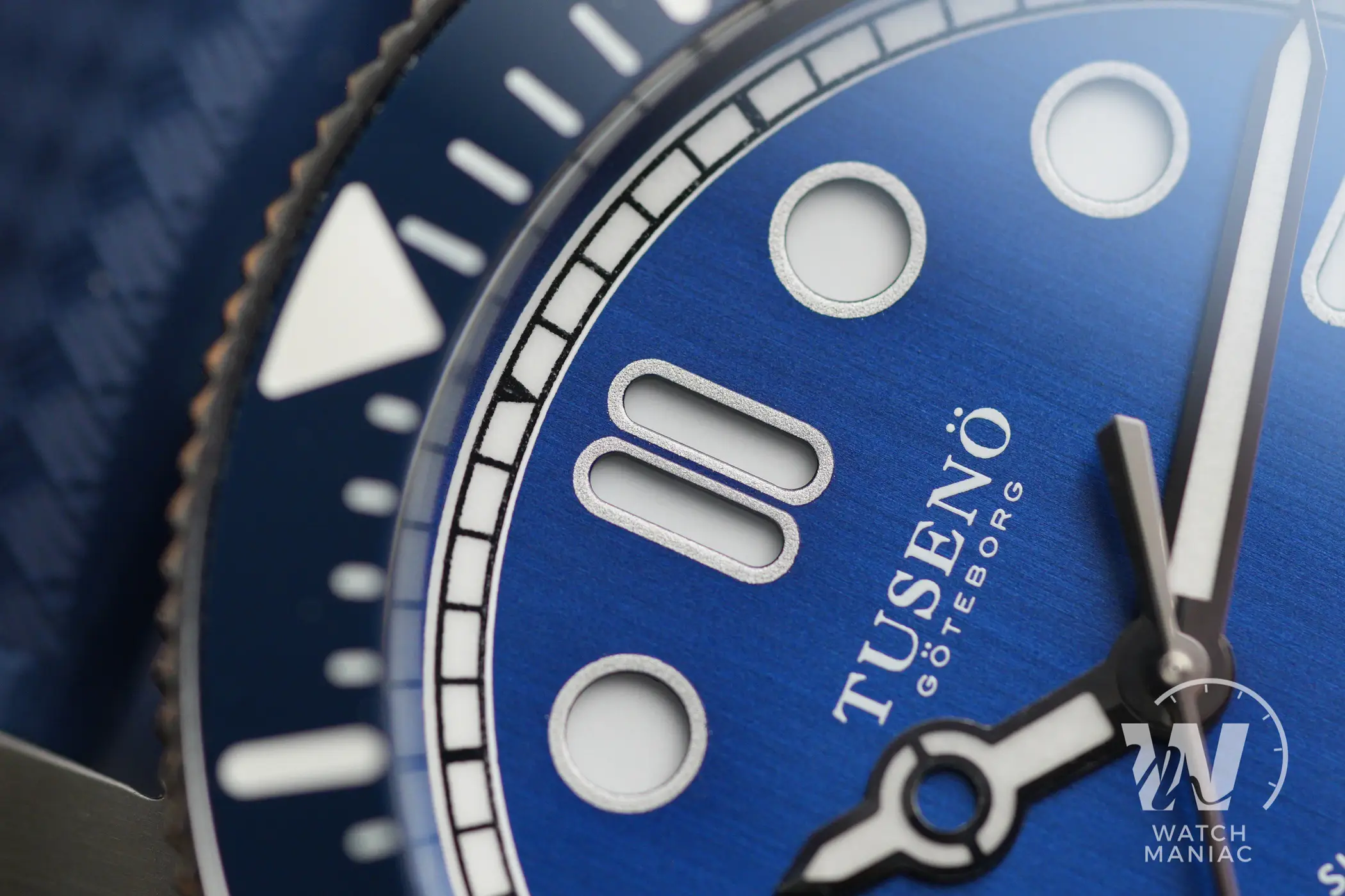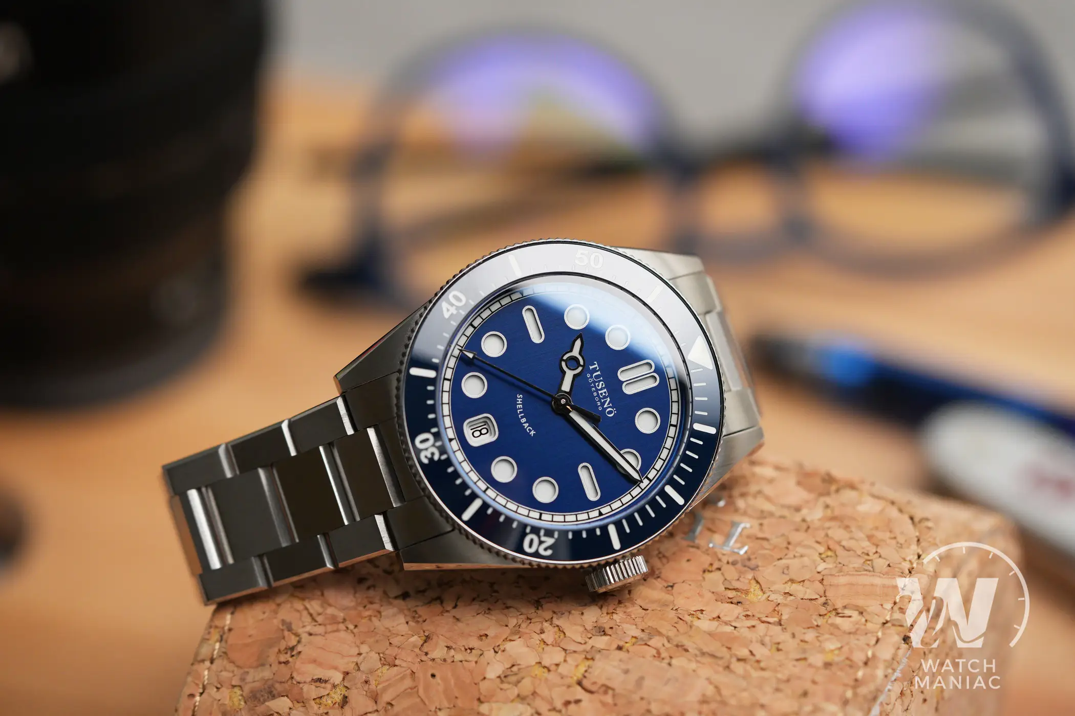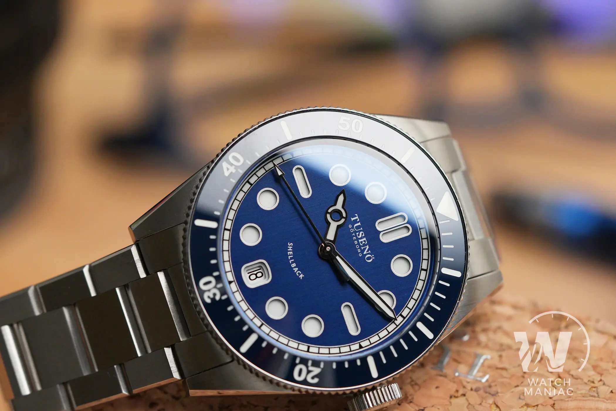 La confezione è molto compatta e all’interno della controscatola in cartone nero si trovano un panno in microfibra marchiato, uno sticker e l’astuccio da viaggio rivestito in sughero. Il Tusenö Shellback V2 è disponibile in 4 varianti, compresa anche una configurazione tutta nera con rivestimento DLC. In fase di acquisto è poi possibile scegliere tra versione con data o senza. Il quadrante blu della versione recensita è l’unico ad avere una finitura spazzolata verticale. Questa crea un effetto cangiante che fa passare il quadrante dal nero al blu elettrico intenso a seconda dell’inclinazione della luce.