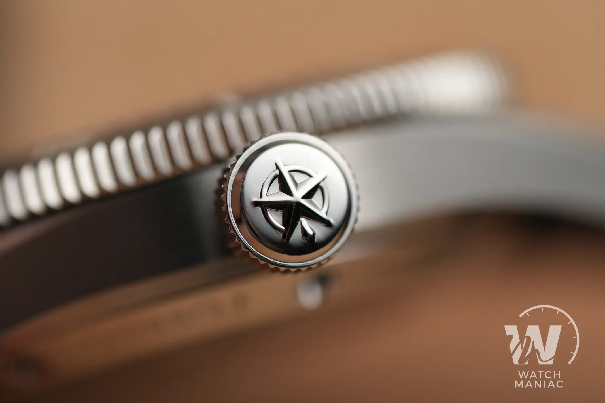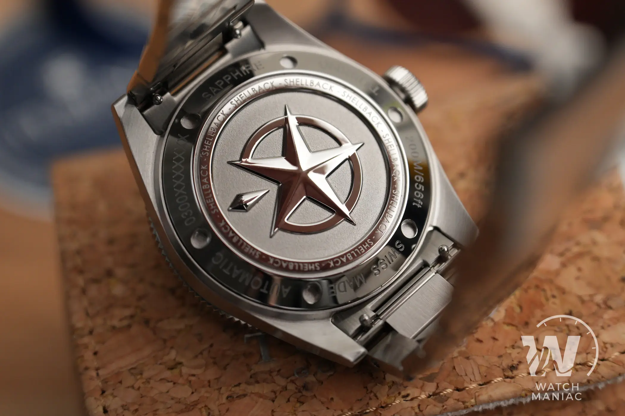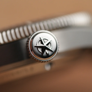 La corona a ore 3 non ha spallette di protezione, è lucida con il logo in rilievo e naturalmente è a vite. La filettatura è molto precisa, senza alcun impuntamento né in apertura né in serraggio. Il fondello a vite è in acciaio e al centro presenta una bella decorazione coniata con il logo del produttore. Questo rappresenta in modo stilizzato la luce di un faro costiero per la navigazione. Sull’anello intorno viene ripetuto il nome del modello e più all’esterno sono incise varie informazioni tra le quali sono ribaditi il marchio Swiss made e il dato sull’impermeabilità.