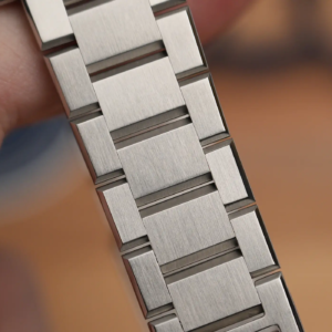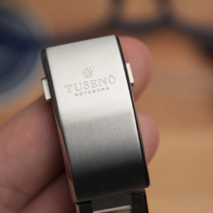 Il bracciale è un’altra piccola meraviglia di questo orologio. Il design è piuttosto spigoloso e si abbina sorprendentemente bene alla cassa. Le maglie sono satinate con biselli lucidi e sono tenute insieme da perni a vite. Quel che conta, però è la loro estrema mobilità che garantisce una perfetta adattabilità alla curvatura del polso. Il tocco di classe poi è dato dalla chiusura, concettualmente simile a quella utilizzata anche da Christopher Ward, con microregolazione rapida integrata. L’escursione è di 9mm, più che sufficienti per riuscire a trovare la misura giusta anche durante le giornate più calde dell’anno. Per preservare il più possibile la bella finitura satinata della scatoletta, la parte più esposta ai graffi quando si lavora spesso al computer, il marchio ha applicato un trattamento superficiale antigraffio con una durezza di 1200 Vickers. Non mancano poi le anse a sgancio rapido per rimuovere facilmente il bracciale e installare uno dei cinturini tropic prodotti da Tusenö.