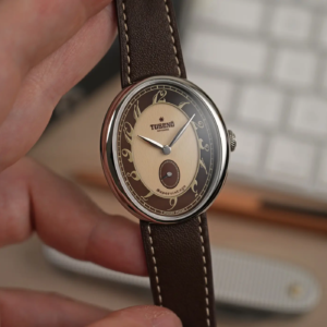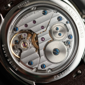 La corona a ore 3 è un po’ più voluminosa di quel che ci si aspetterebbe su un modello elegante, ma è una scelta principalmente legata alla funzionalità, visto che il movimento all’interno è a carica manuale. In ogni caso non sporge troppo e, anche per questo dettaglio, Tusenö ha curato in modo maniacale il design, con la zigrinatura antiscivolo ad andamento elicoidale. Naturalmente si tratta di una corona a pressione. Anche il fondello è a pressione e, del resto, l’impermeabilità arriva solo fino a 3bar, in linea con la tipologia dell’orologio e con l’utilizzo per cui è stato pensato.