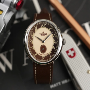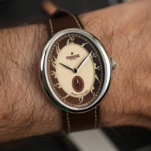 Normalmente tendo a preferire modelli più grandi e non sono un grande fan degli orologi di forma, ma il Tusenö Supervintage ha un design davvero ben riuscito, al poslo è sorprendente e non dà in alcun modo l’impressione di essere troppo piccolo. La larghezza è di 34,5mm, la distanza da ansa ad ansa è di 40,5mm, lo spessore è di 8,7mm incluso anche il vetro e il peso con il cinturino è di 67g.