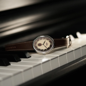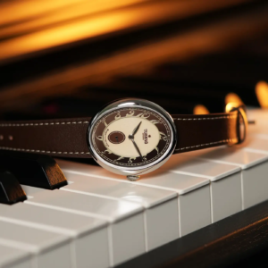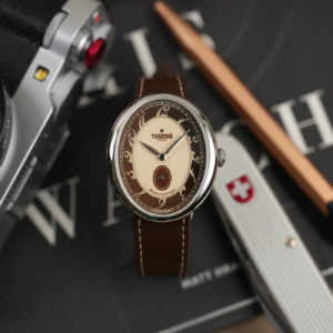 La parte centrale del quadrante in questa versione ha una lavorazione superficiale che crea l’effetto della schiuma di un Espresso Martini. La secondina, di forma ovale per meglio adattarsi alle linee del Supervintage, è su un livello leggermente più basso rispetto a quello principale. La parte più esterna del quadrante è occupata da un anello ovale con una colorazione sfumata, più chiara sul lato sinistro e più scura sul lato destro, con gli indici numerici stampati.
