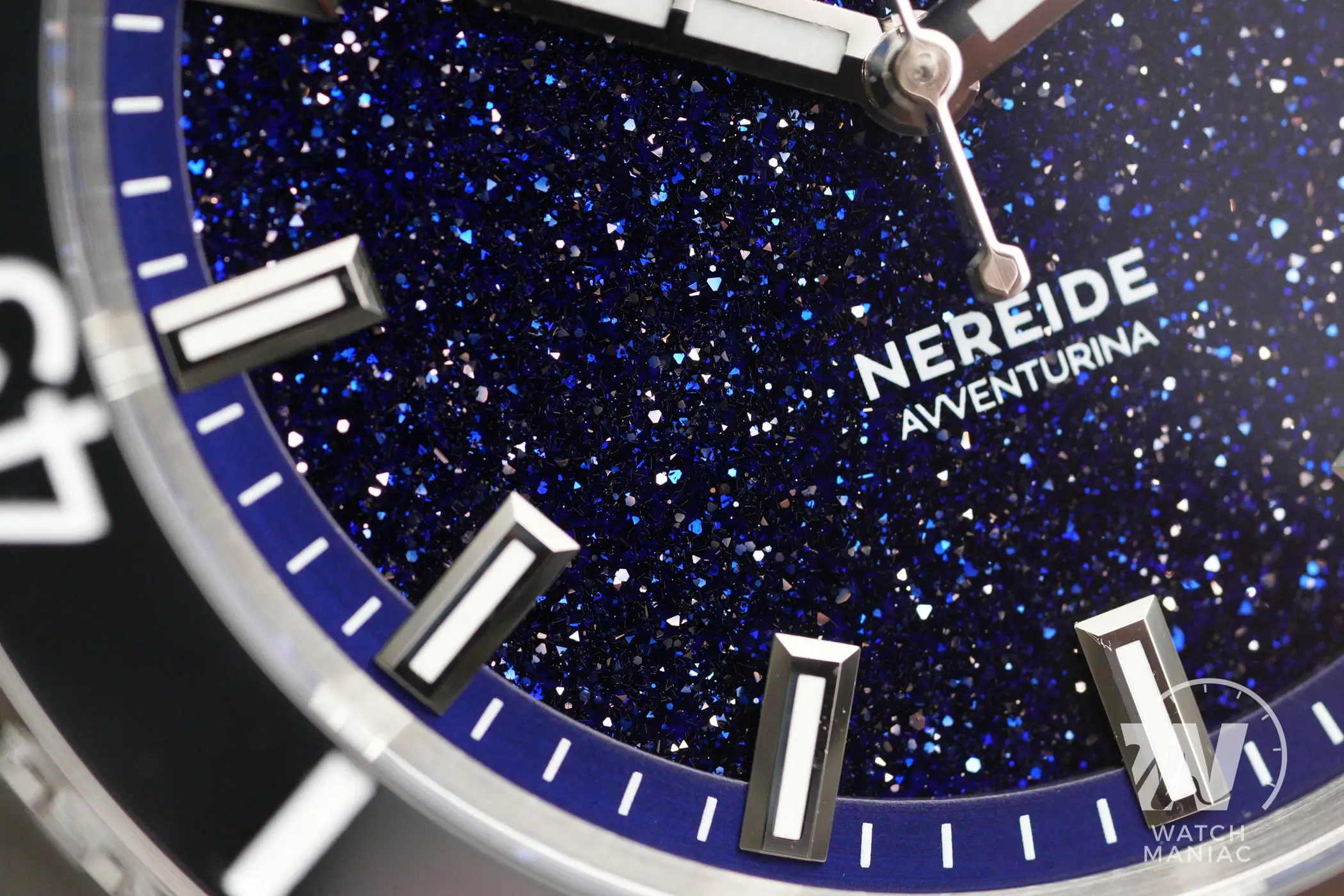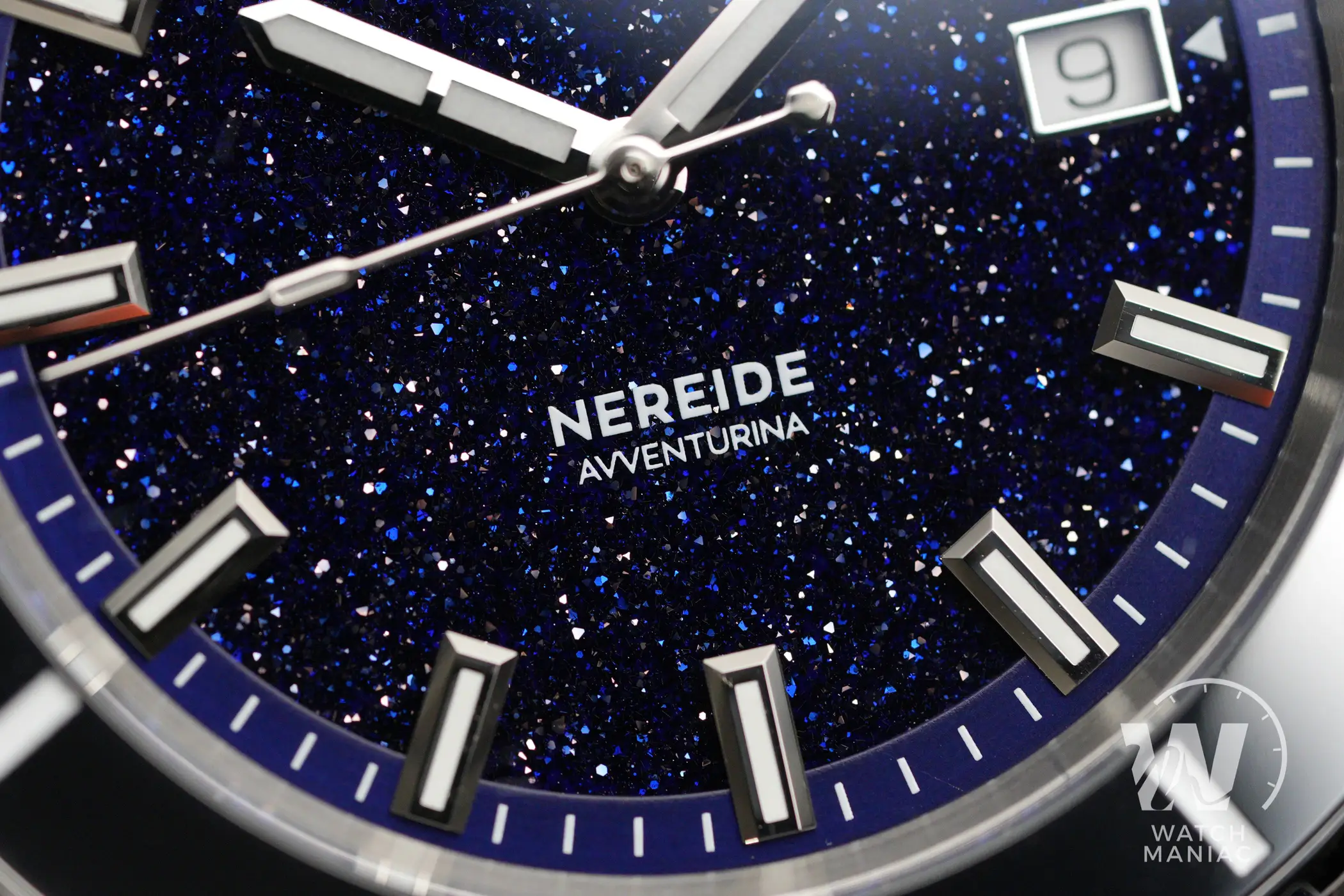 Mi è capitato di vedere altri orologi con quadrante in avventurina e tutte le altre volte, in questa fascia di prezzo, il materiale utilizzato mi ha sempre dato l’impressione di essere un po’ “spento” e poco brillante. Il quadrante di questo Nereide, invece, è ipnotico. Con la giusta illuminazione il blu risulta essere bello profondo e viene ravvivato dalla grande quantità di inclusioni metalliche che brillano costantemente al variare dell’incidenza della luce.