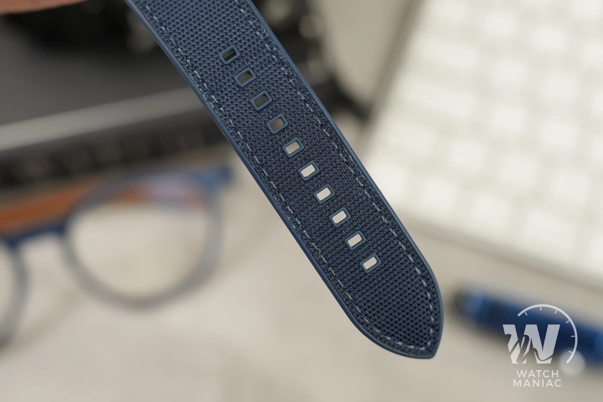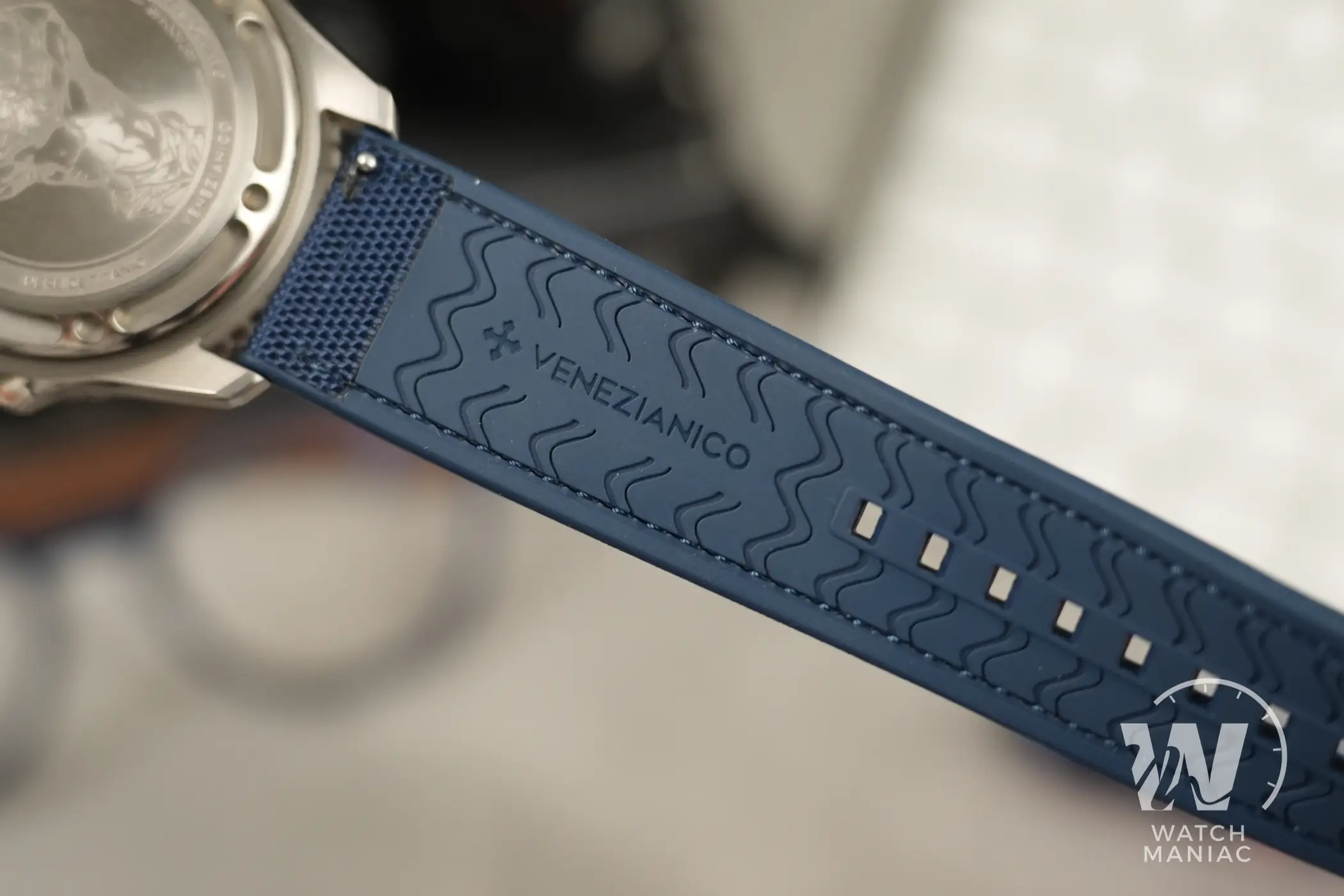 Anche il cinturino è una novità assoluta per Venezianico. È di tipo ibrido, realizzato mettendo insieme una base in gomma FKM con un inserto in tessuto. Il marchio italiano non è l’unico ad adottare una soluzione del genere, ma qui colpisce parecchio la cura dei dettagli, la flessibilità e, durante la prova, anche la resistenza non è sembrata da meno. La fibbia ad ardiglione è in titanio, proprio come la cassa e non mancano le anse a sgancio rapido per passare ad altri cinturini senza utilizzare attrezzi specifici. È poi possibile ordinare come extra un cinturino elastico in nylon in stile Marine National.