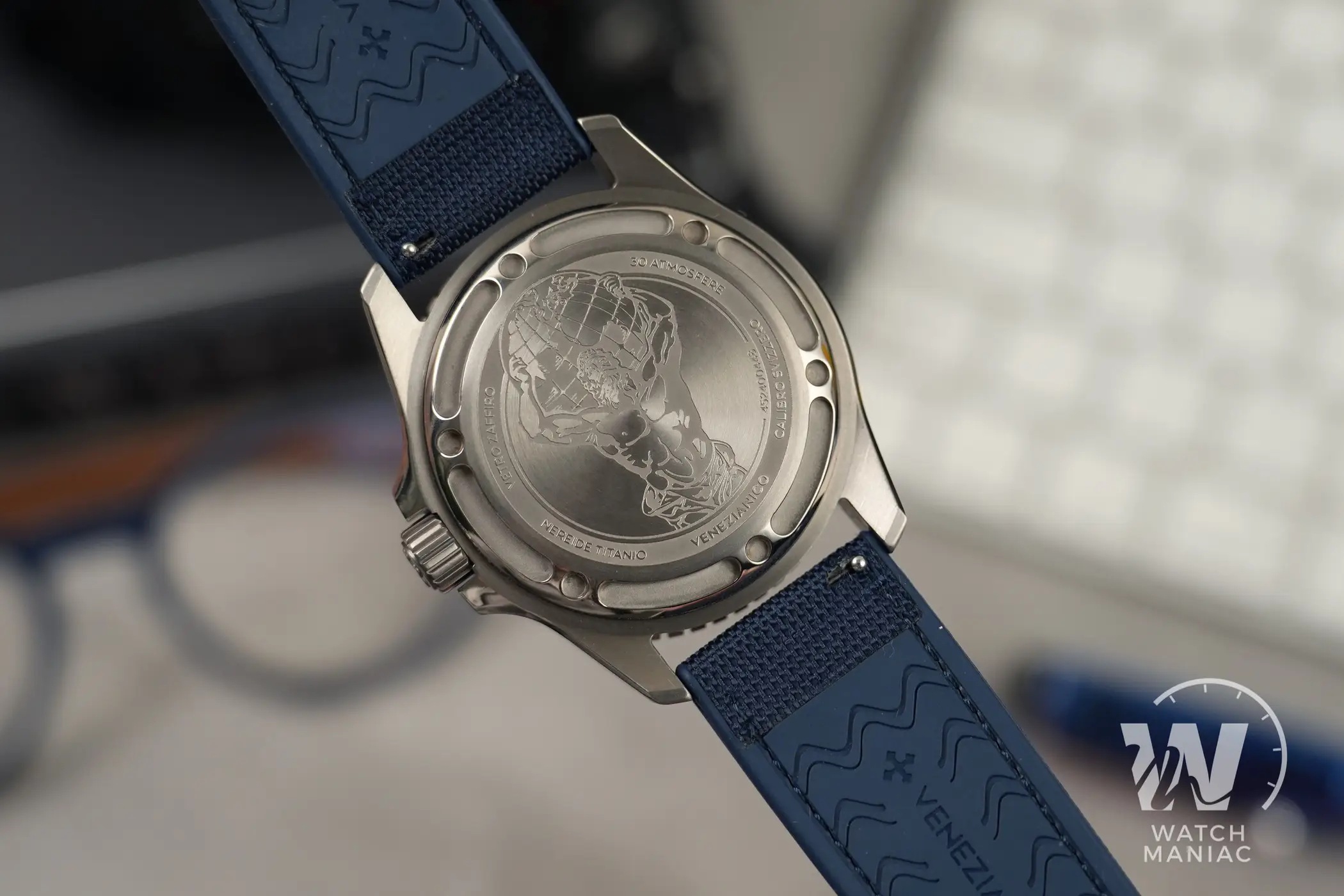 Così come sul Nereide Bronzo, anche in questo caso c’è un fondello a vite, una scelta costruttiva più adatta ad un diver. Al centro c’è una bella decorazione che raffigura Atlante, il Titano che secondo la mitologia greca aveva il compito di sorreggere il mondo. Questo soggetto rinnova il legame tra il marchio italiano e la città di Venezia, visto che rende omaggio alla statua nel cortile di Palazzo Ducale. Anche qui le lavorazioni sono tutt’altro che banali, con finitura satinata e micropallinata che si alternano e fresature di alleggerimento sulla parte lucida più esterna.