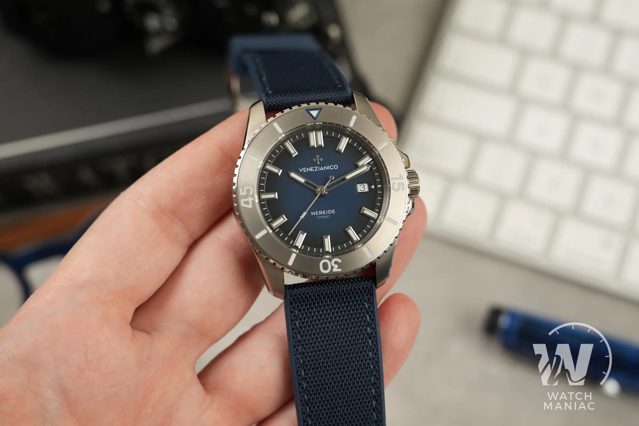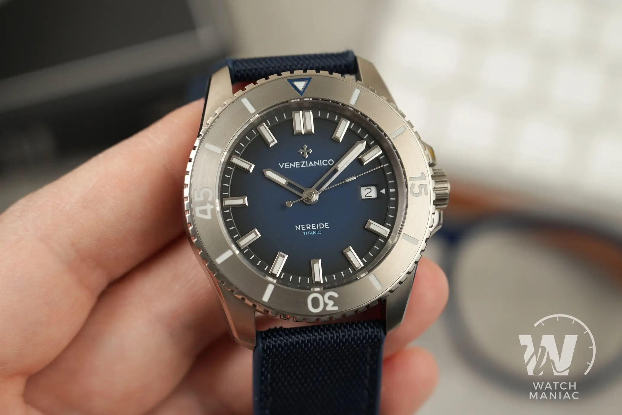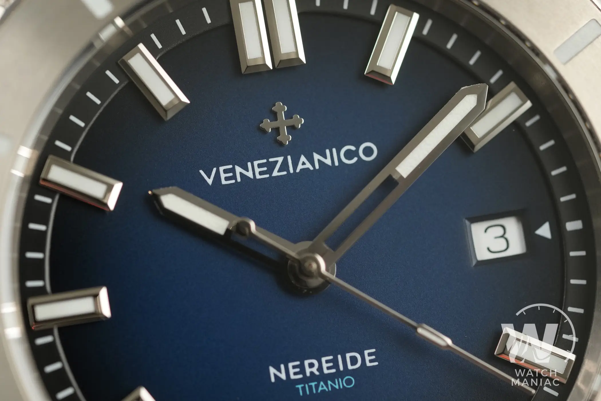 Il Venezianico Nereide Titanio ha un bellissimo quadrante blu opaco degradé con scritte ridotte al minimo indispensabile. La data è posizionata a ore 3 e utilizza un disco a sfondo bianco. Gli indici a bastone sono applicati sull’anello della minuteria e hanno cornici lucide e sfaccettate ben rifinite anche se osservate con la lente macro. Proprio come avevamo già avuto modo di vedere sul Nereide Avventurina, questa soluzione fa quasi fluttuare gli indici sul quadrante e dà un bel senso di tridimensionalità. Le sfere mantengono lo stesso design già adottato sulle altre varianti, ma in questo caso sono parzialmente scheletrate. Una scelta in linea con quanto fatto sul Nereide Bronzo. Al buio la visibilità è ottima, non solo per sfere e indici ma anche in corrispondenza dei vari riferimenti della ghiera. La tipica luminescenza tendente al blu della Superluminova BGW9 è uniforme e duratura anche a distanza di parecchio tempo dall’esposizione ad una fonte di luce.