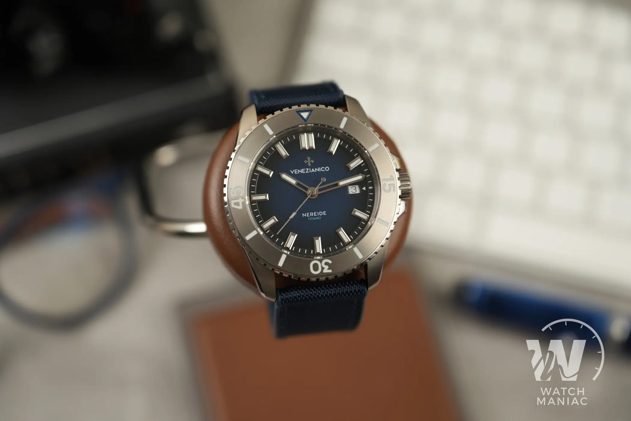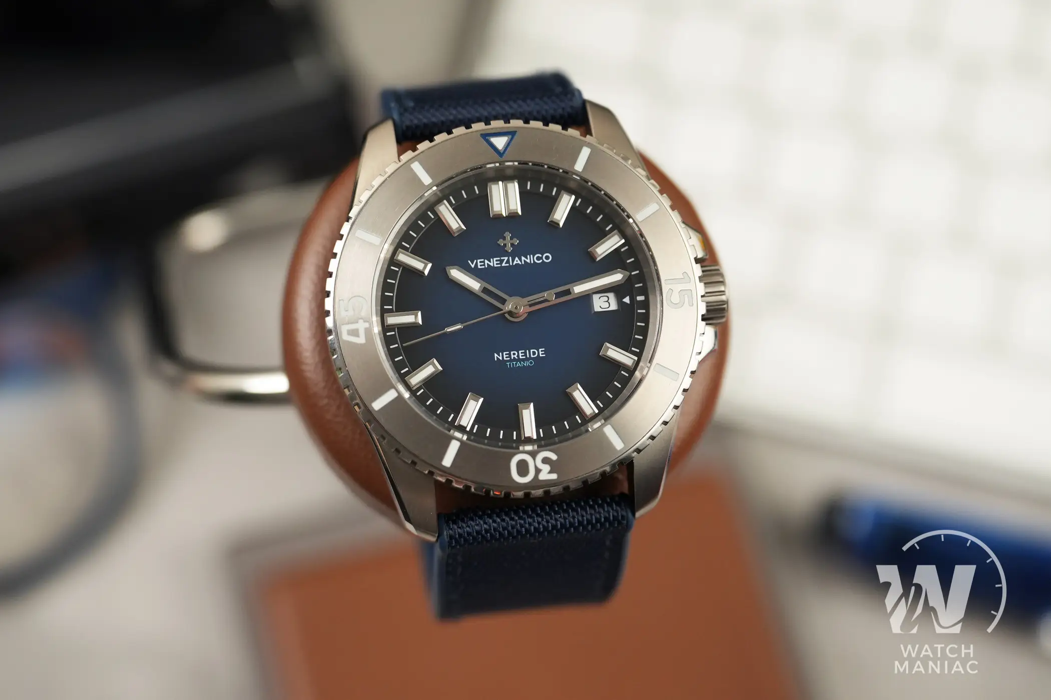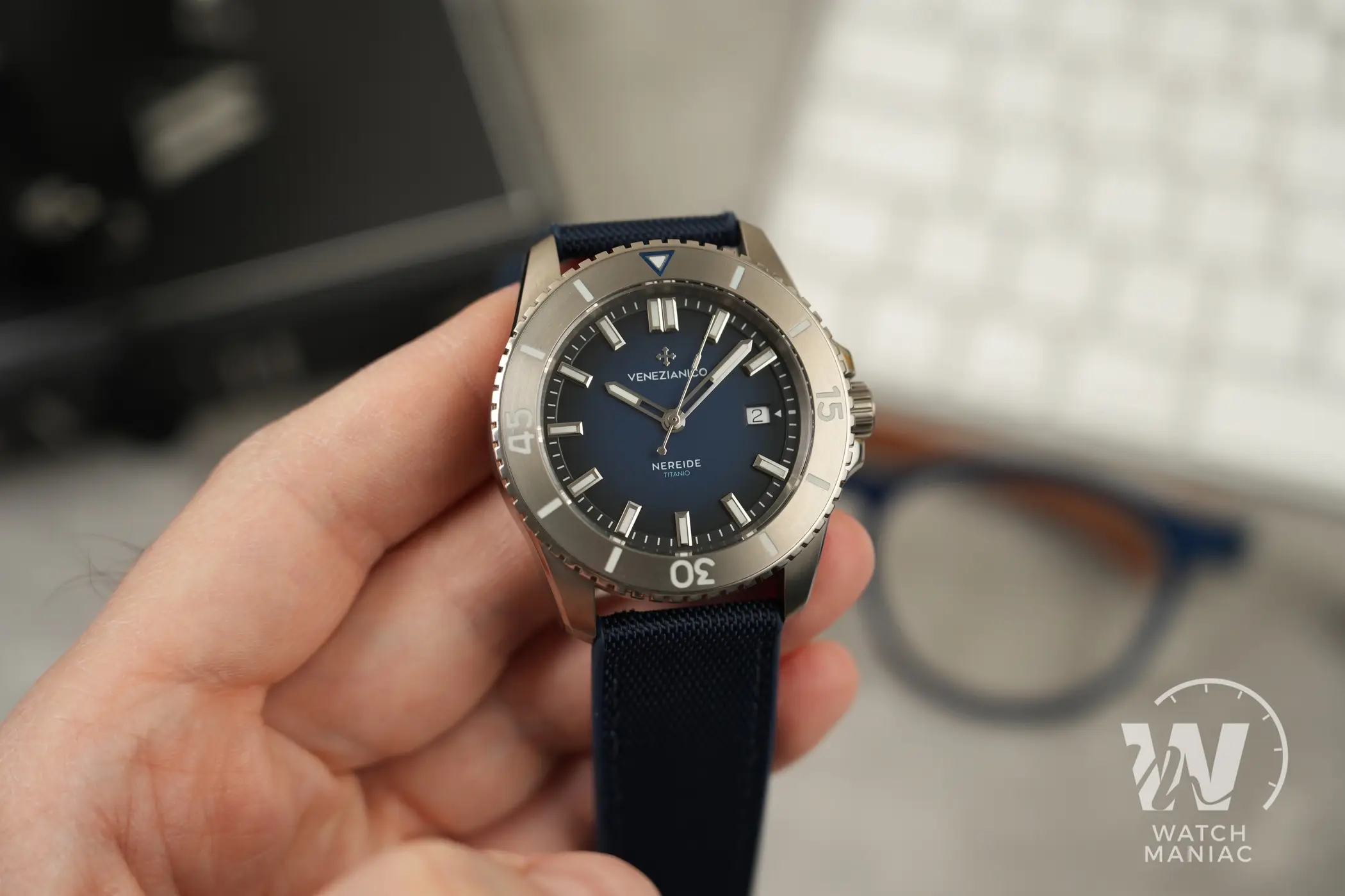 Il Venezianico Nereide Titanio ha un bellissimo quadrante blu opaco degradé con scritte ridotte al minimo indispensabile. La data è posizionata a ore 3 e utilizza un disco a sfondo bianco. Gli indici a bastone sono applicati sull’anello della minuteria e hanno cornici lucide e sfaccettate ben rifinite anche se osservate con la lente macro. Proprio come avevamo già avuto modo di vedere sul Nereide Avventurina, questa soluzione fa quasi fluttuare gli indici sul quadrante e dà un bel senso di tridimensionalità. Le sfere mantengono lo stesso design già adottato sulle altre varianti, ma in questo caso sono parzialmente scheletrate. Una scelta in linea con quanto fatto sul Nereide Bronzo. Al buio la visibilità è ottima, non solo per sfere e indici ma anche in corrispondenza dei vari riferimenti della ghiera. La tipica luminescenza tendente al blu della Superluminova BGW9 è uniforme e duratura anche a distanza di parecchio tempo dall’esposizione ad una fonte di luce.