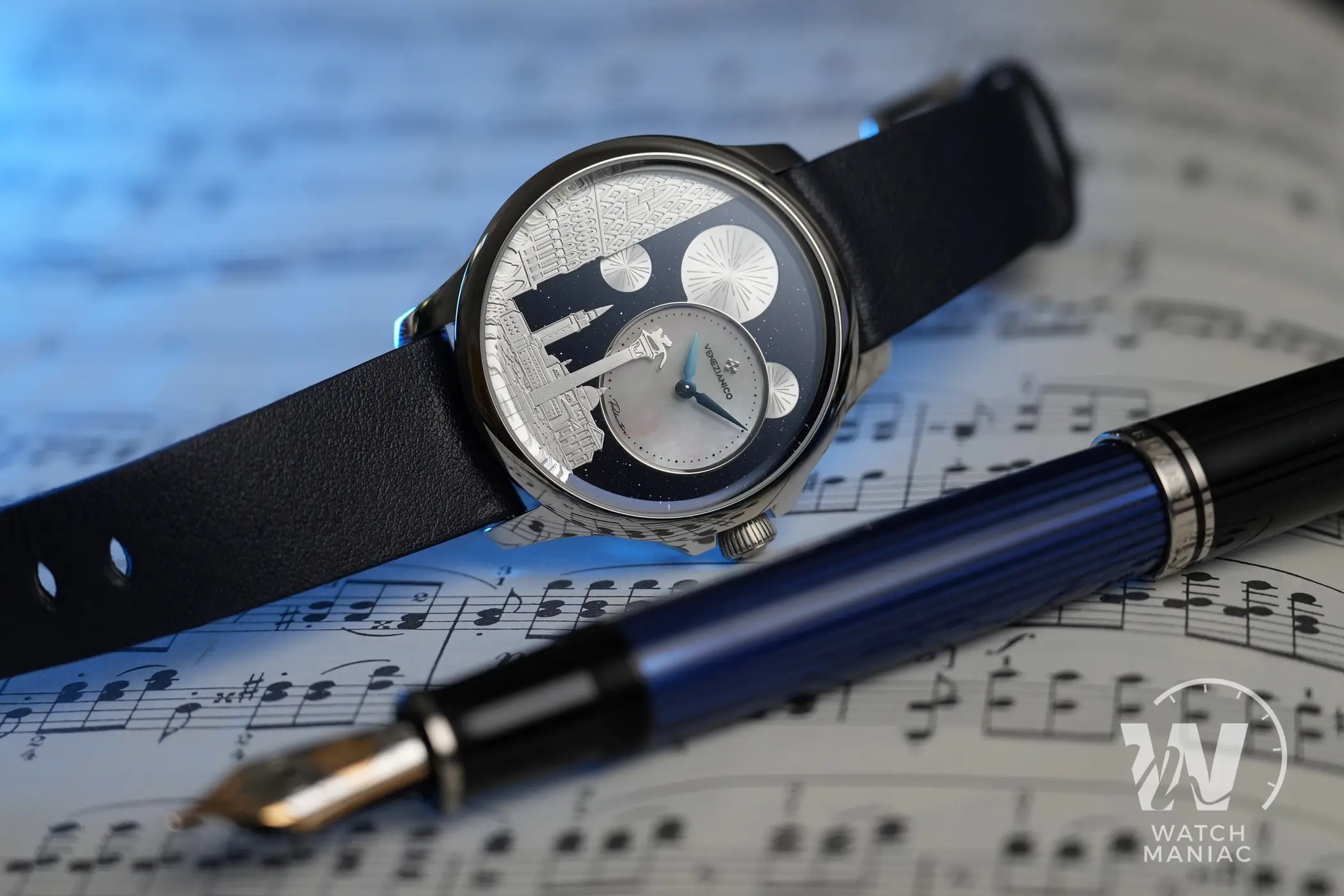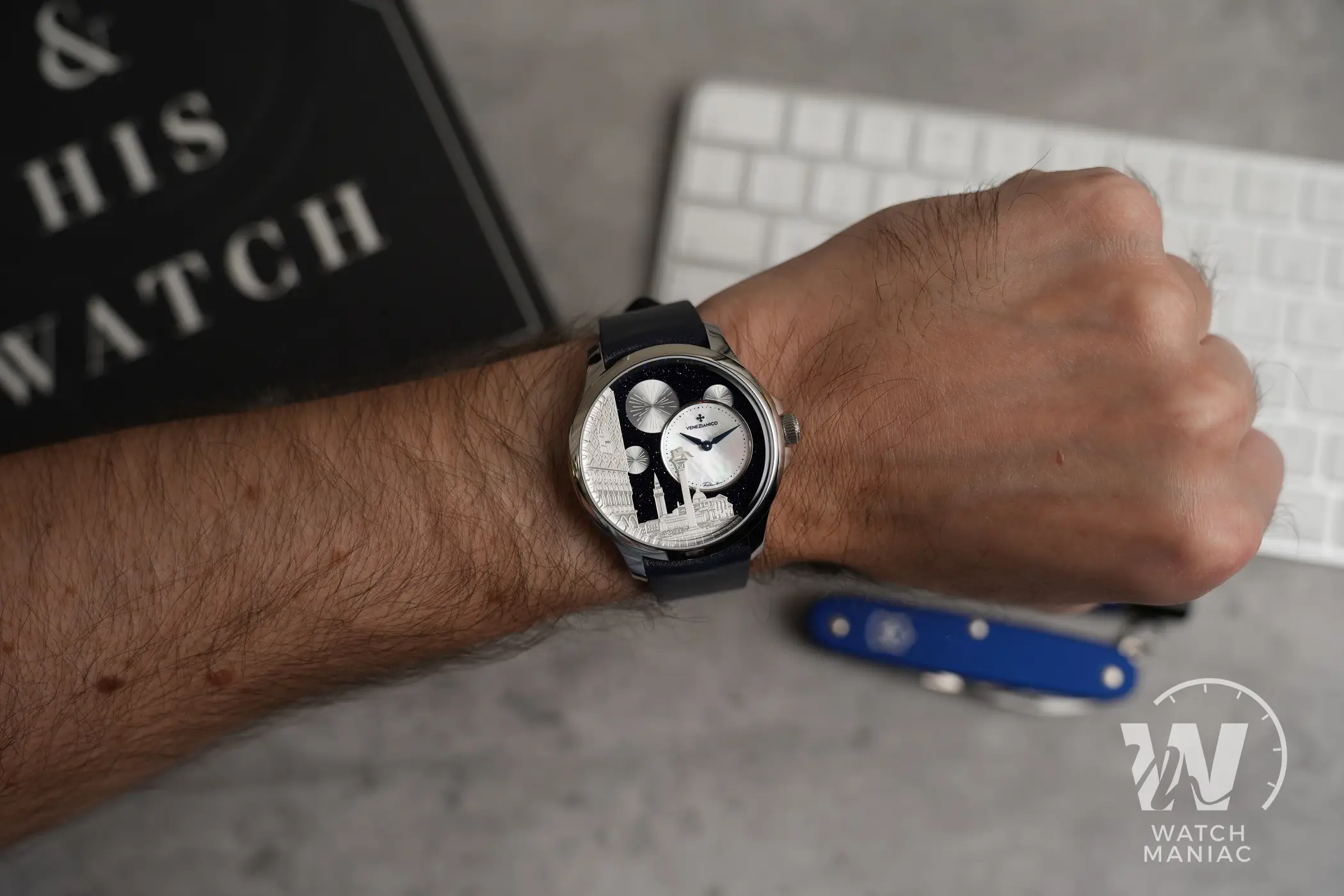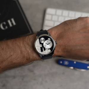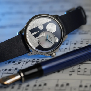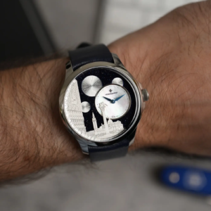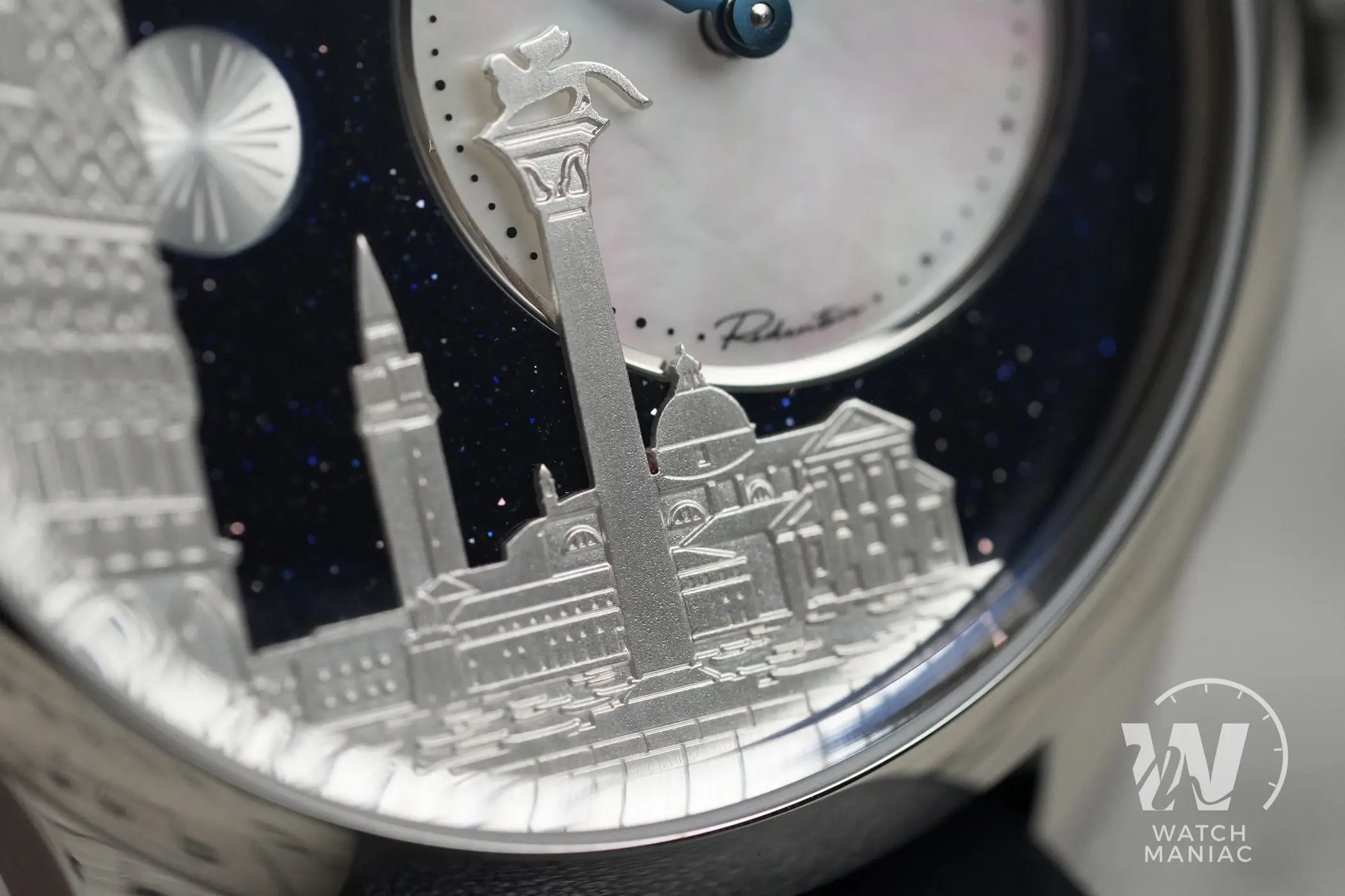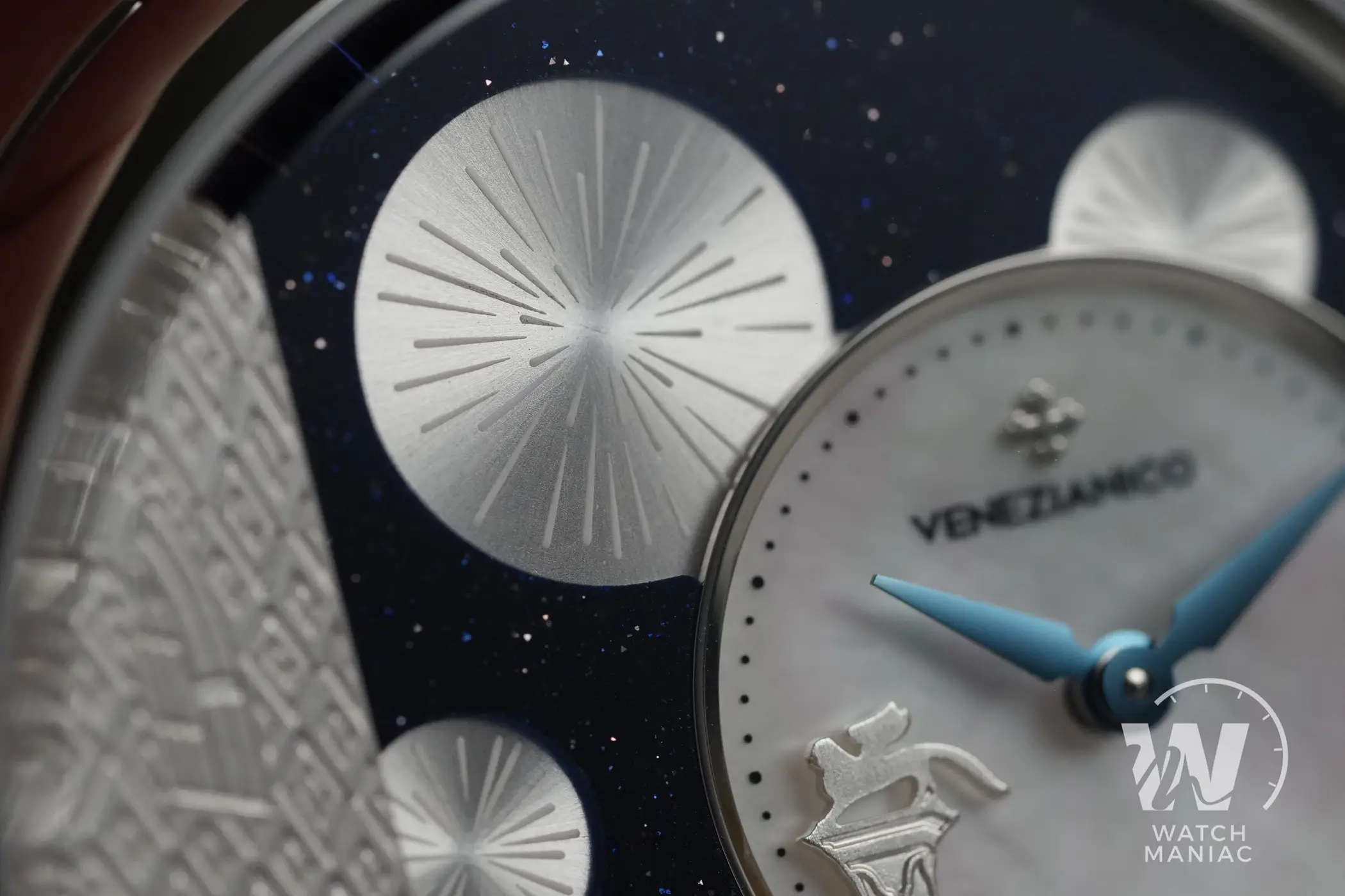 Il quadrante vero e proprio è decentrato ed è in madreperla, che con la sua superficie irregolare sembra quasi rappresentare una luna piena ed è separato dall’avventurina tramite un anello con finitura lucida. Le lancette hanno una finitura azzurra che le fa risaltare alla giusta angolazione e in basso in piccolo è stampato il nome del modello. Nell’insieme è un quadrante che cattura lo sguardo e stupisce parecchio, soprattutto osservandolo con attenzione con la lente macro che rivela una gran cura nelle lavorazioni. Molto bello anche l’effetto tridimensionale dato proprio dai 4 livelli differenti.