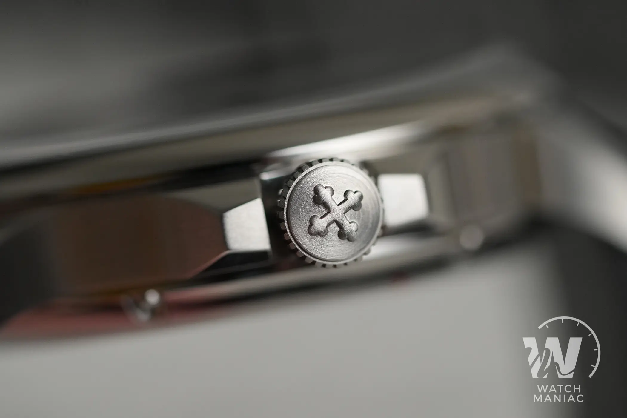 La corona a ore 3, in parte protetta dalle spallette nonostante non si tratti di un diver, è satinata e riporta il logo di Venezianico in rilievo. Come sugli altri Redentore, anche in questo caso è una corona a pressione.
