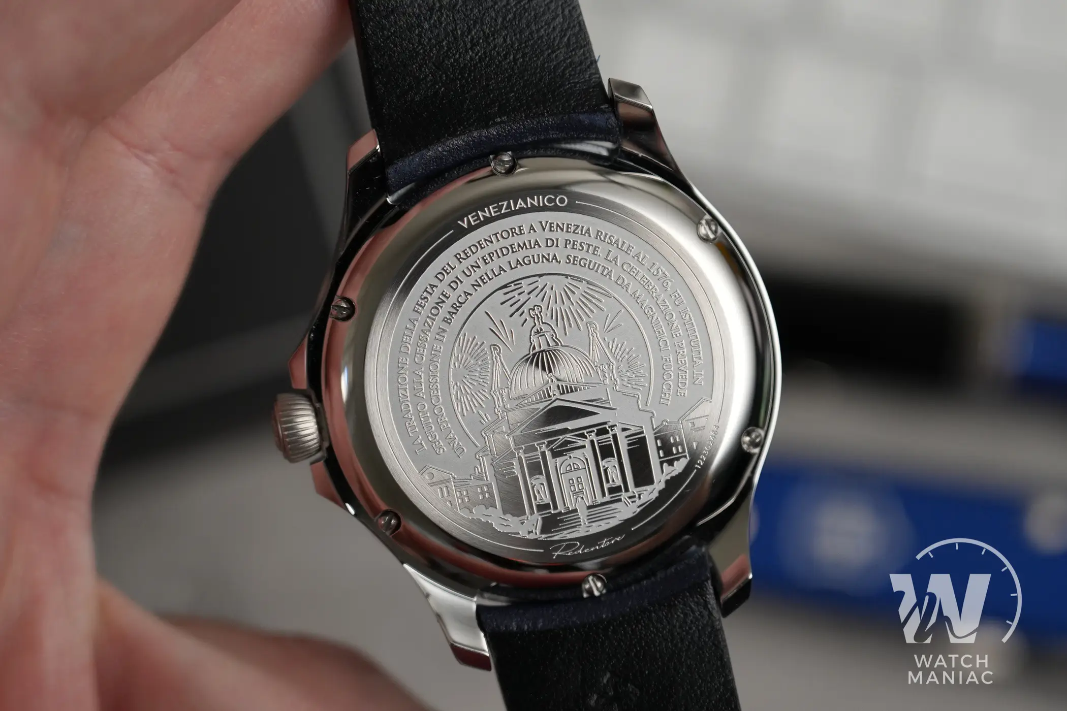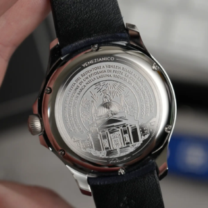 Il fondello è tenuto in sede da 6 viti e presenta al centro una bella raffigurazione della Basilica del Redentore, con tanto di descrizione di ciò che rappresenta la festa del Redentore.