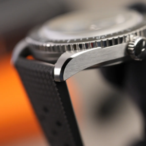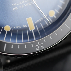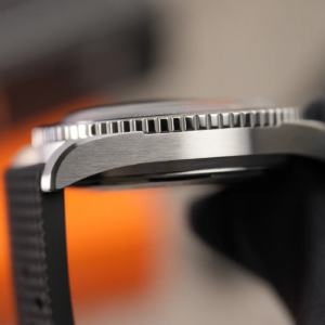 La cassa merita una menzione speciale perché, se è vero che gran parte degli skin diver condividevano (e condividono tuttora) dei design molto simili tra loro, il Vulcain sfoggia un tocco di originalità in più. Questo si nota soprattutto osservando le anse snelle e i bellissimi biselli lucidi. Proprio osservando l’alto livello delle finiture è possibile apprezzare quanto il produttore svizzero abbia curato in modo maniacale questo aspetto. Il fianco, già sufficientemente sottile di per sé, viene ulteriormente alleggerito da un incavo nella carrure all’interno del quale trova alloggiamento la ghiera. La corona a ore 3 non presenta delle particolarità: è lucida con il logo in rilievo, naturalmente è a vite e la filettatura è molto precisa sia in apertura che in serraggio.