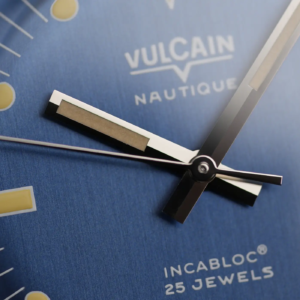 La riedizione moderna del Vulcain Skindiver Nautique è disponibile con quadrante nero o blu. C’è stata anche una limited edition in colorazione salmone, molto bella, ma purtroppo ormai esaurita. Se il quadrante nero è estremamente classico ed è anche il più fedele al modello vintage degli anni’60, quello blu aggiunge un bel po’ di brio in più, non tanto per il colore ma per la sua lavorazione. La satinatura verticale crea un effetto cangiante a seconda dell’inclinazione con cui viene colpita dalla luce, andando dal grigio scuro al blu jeans. Le scritte sono ridotte al minimo e ricalcano l’impostazione grafica del modello originale. Naturalmente ci sono delle differenze per quanto riguarda i rubini all’interno del movimento e la Superluminova che ha sostituito il radio. Manca la data, altro dettaglio in linea con lo skin diver vintage. Le sfere a bastone hanno una finitura lucida di ottima qualità anche se osservate con la lente macro.