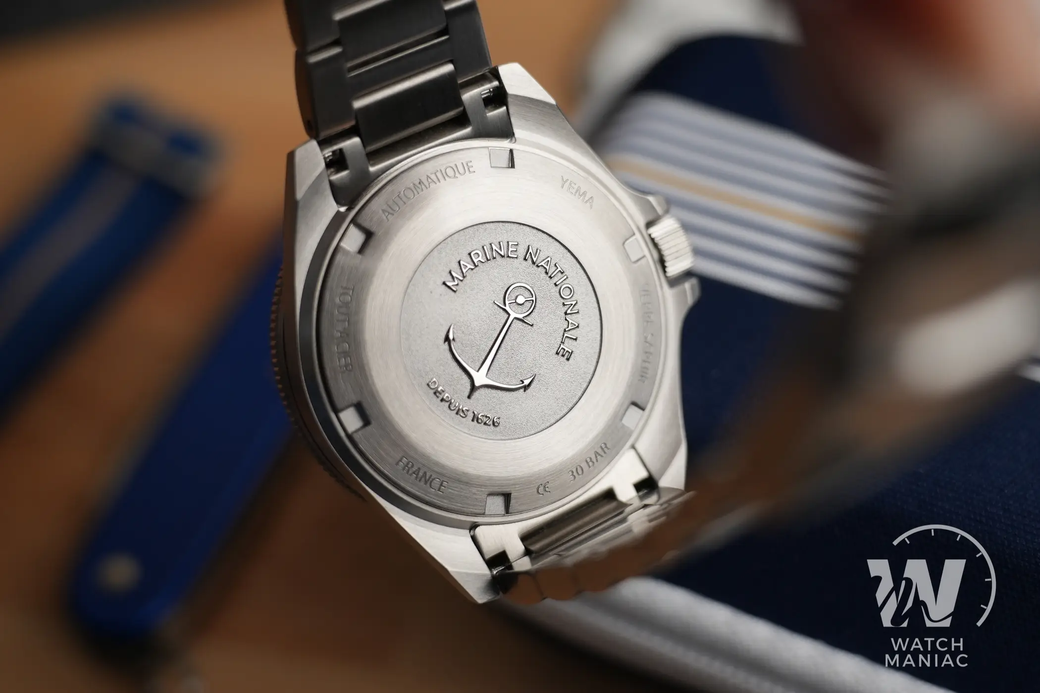La cassa è certamente uno dei pezzi forti di questo Navigraf, che nonostante le sue misure da scheda tecnica ha un design molto muscoloso dato dalle anse spigolose. Quel che colpisce parecchio è il livello delle finiture, nettamente superiore rispetto a quanto riscontrato negli altri diver recenti del marchio francese. Le superfici sono in gran parte satinate, sia sulle anse che sui fianchi, e ci sono dei vistosi biselli lucidi che impreziosiscono il tutto. La corona a ore 3 è racchiusa tra le spallette, integrate in modo magistrale nella carrure. Il rovescio della medaglia è che essendo così tanto protetta, non è particolarmente comoda quando deve essere svitata o serrata. La filettatura comunque è molto precisa e la presenza dell’ancora in rilievo per sottolineare la collaborazione con Marine Nationale è un tocco di classe.