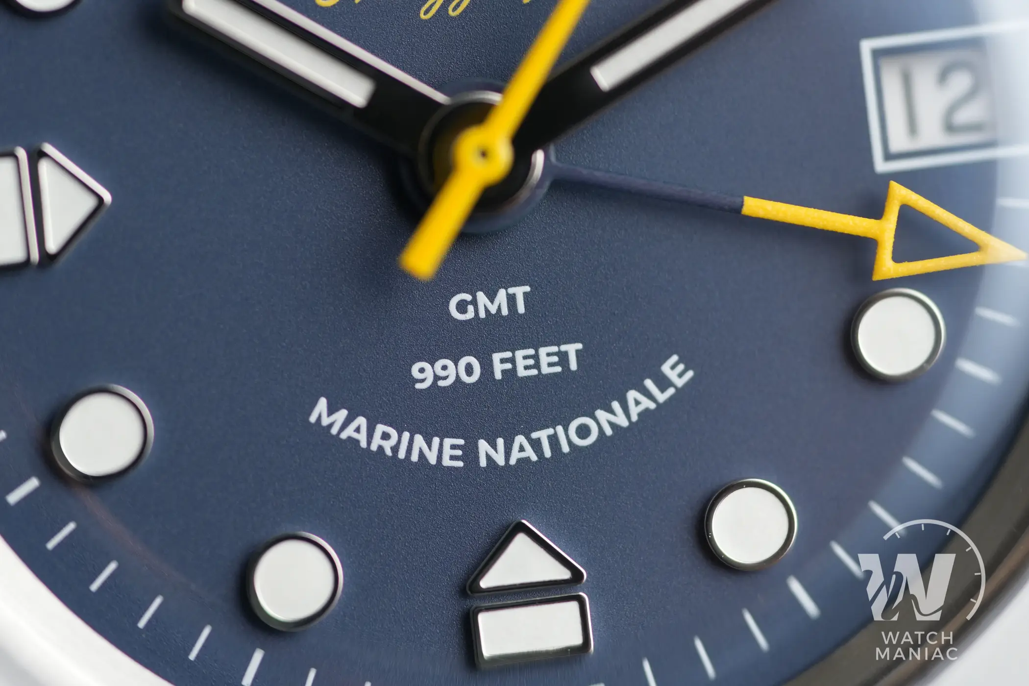 La data a ore 3 è contornata da una cornice bianca stampata. Gli indici, applicati e con cornici lucide, sono per la maggior parte a bicchierini, mentre quelli a ore 6, 9 e 12 presentano un design piuttosto originale. Le sfere di ore e minuti sono molto semplici, a matita e con finitura lucida. In colorazione gialla spiccano la lancetta dei secondi e il freccione scheletrato per la funzione GMT.
