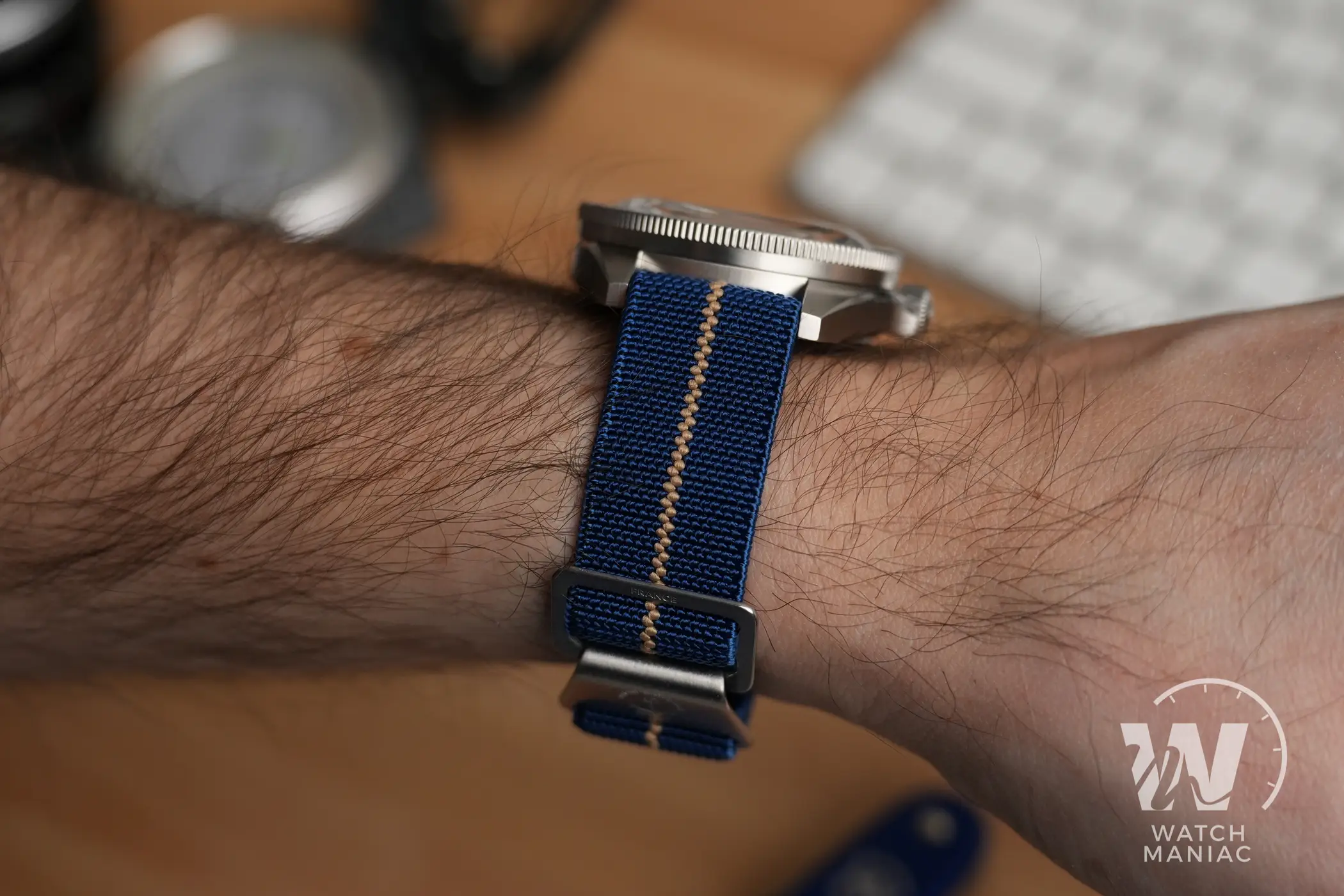 Il cinturino in nylon elasticizzato è piacevole da vedere e da indossare ed essendo un single pass non aggiunge troppo spessore al di sotto della cassa. Quando è installato fa risaltare ancora di più i colori del quadrante e sul gancio per la chiusura è inciso il logo di Marine Nationale.