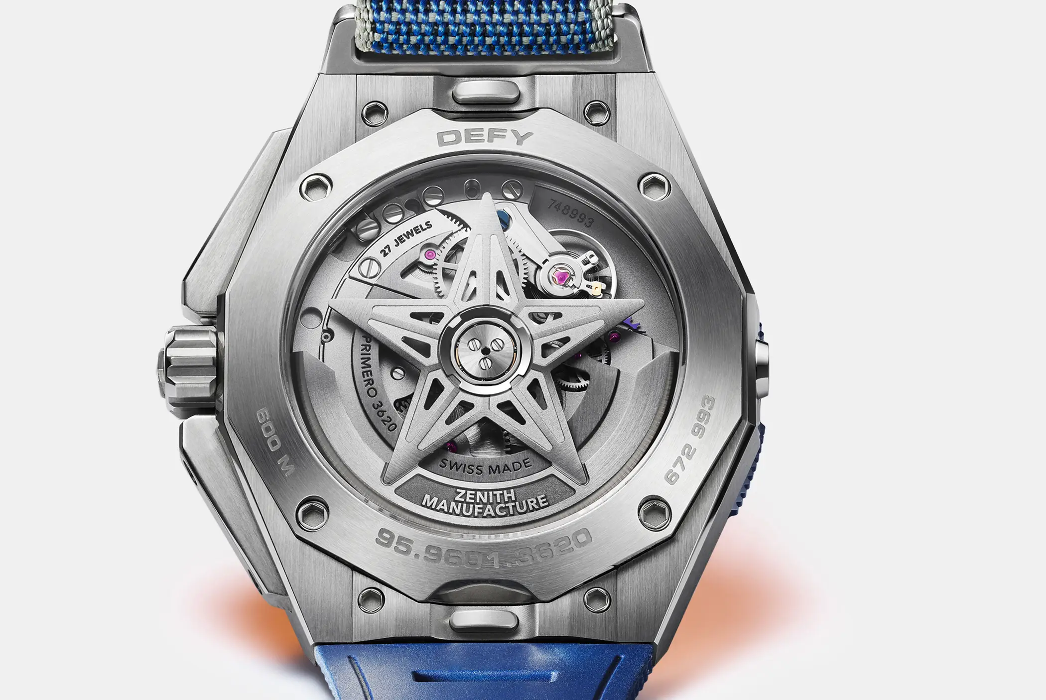 Il cuore del Defy Extreme Diver è il calibro El Primero 3620-SC, un derivato del 3600 utilizzato su tutti i più recenti cronografi di Zenith, con il quale condivide l’alta frequenza a 36.000a/h. La riserva di carica arriva fino a 60 ore e lo scappamento utilizza componenti in silicio per una maggior resistenza ai campi magnetici.