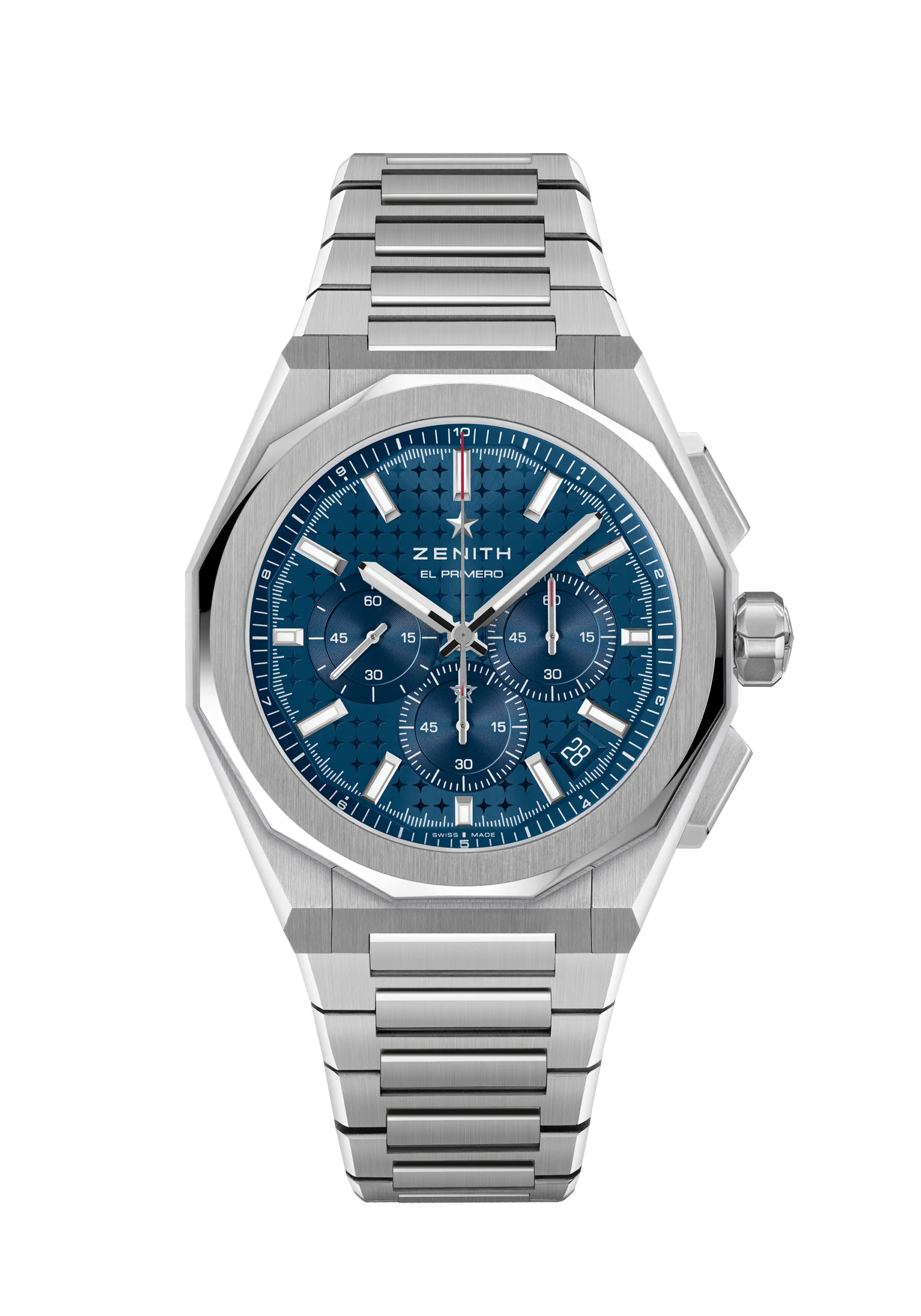 Partendo dal Defy Skyline presentato nel 2022, successivamente rivisto anche in versione scheletrata, Zenith completa la gamma con l’aggiunta del cronografo, una complicazione fortemente legata all’identità del marchio di Le Locle. La cassa in acciaio è poco più grande dei modelli solo tempo, arrivando a 42mm di diametro e per il suo design prende spunto dalla cassa ottagonale introdotta con il primo Defy. I pulsanti seguono l’andamento della cassa, senza sporgere troppo dalla carrure. Il quadrante riprende quello già visto sugli altri modelli Skyline, con la trama a stelle che si ricollega al logo di Zenith.