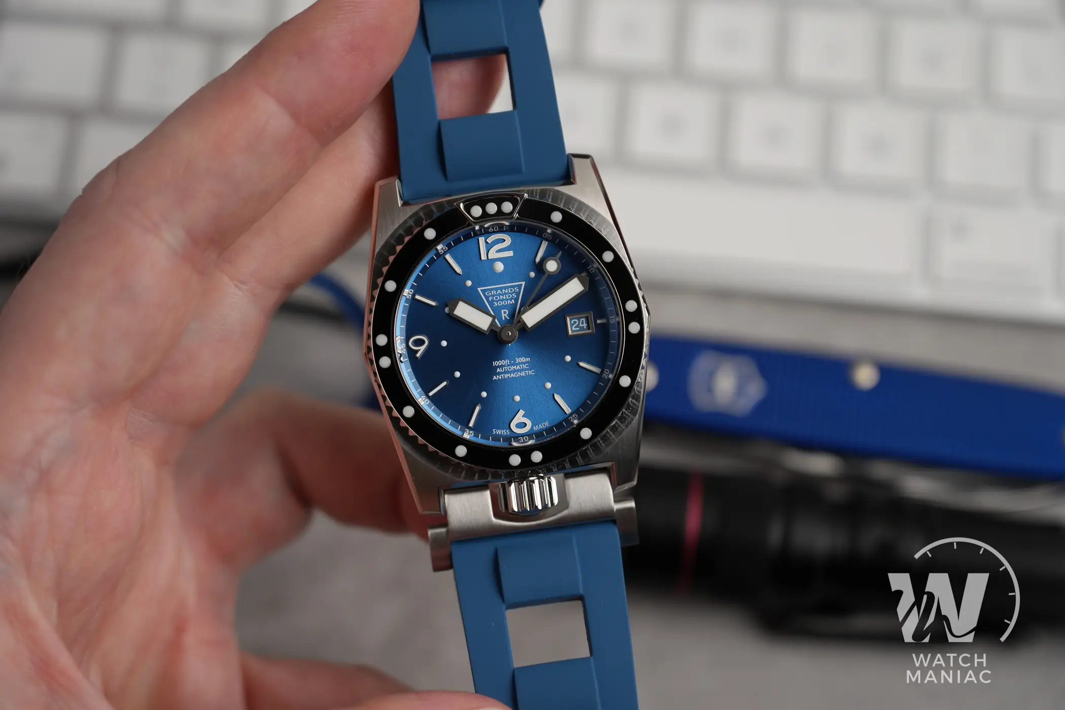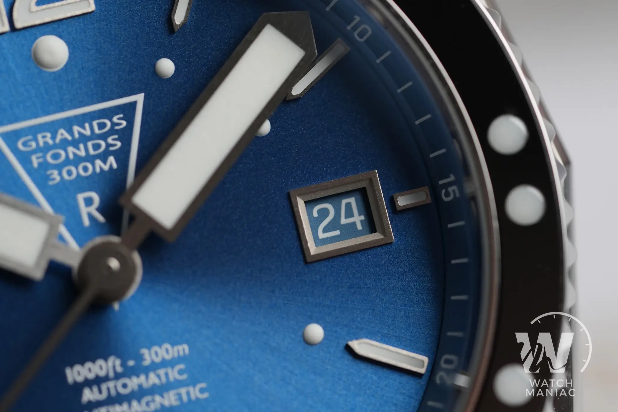 Oggi ZRC offre sostanzialmente tre opzioni a chiunque voglia rivivere il fascino del Grands Fonds. Ci sono le referenze Heritage GF 30, con cassa più piccola da 39mm e finiture e lavorazioni più fedeli allo spirito vintage dell’orologio. Per i più esigenti ci sono i GF 3000 certificati per resistere fino a 3.000m di profondità e con cassa in titanio da 42mm. A metà strada, tra gli Heritage e i top di gamma, ci sono i GF 300 con cassa da 41,5mm in acciaio, finiture più elaborate e alcune soluzioni tecniche più raffinate rispetto ai GF 30. La variante Osmium fa parte proprio di quest’ultimo gruppo di modelli. Fin dal primo istante è difficile non rimanere impressionati dal suo fantastico quadrante blu azzurro con finitura soleil. La tonalità scelta è davvero incredibilmente bella ed è una valida opzione se non si è eccessivamente tradizionalisti e ci si vuole allontanare un po’ dal classico nero.