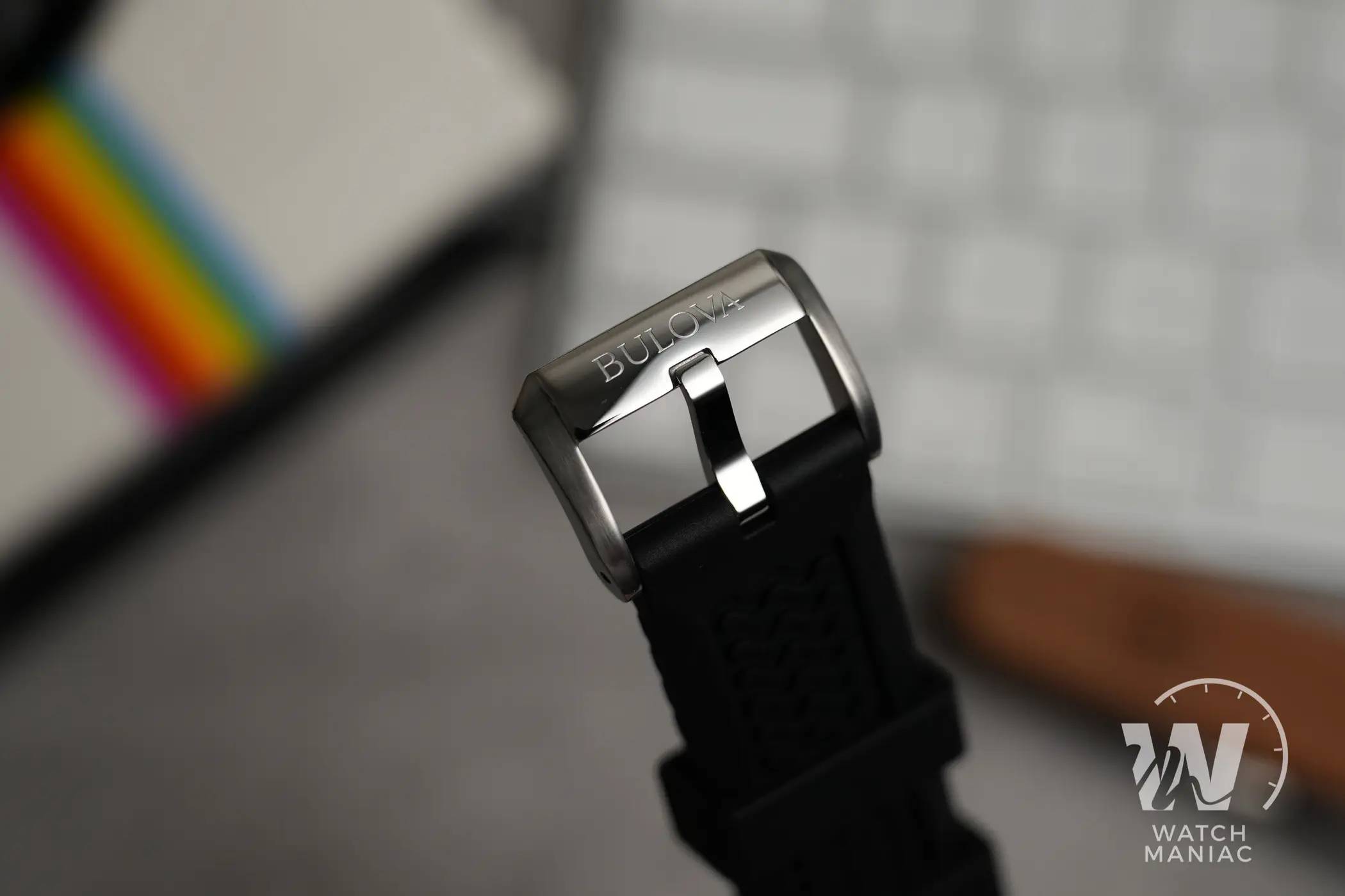 La corona ha una finitura lucida e presenta il diapason di Bulova inciso al laser. È a vite e la filettatura è molto precisa sia in apertura che in serraggio. Il fondello a vite non presenta particolari decorazioni. È in gran parte satinato con la sola eccezione del bisello all’esterno che è lucido. Tra le varie indicazioni incise è riportato anche il dato sull’impermeabilità fino a 200m.