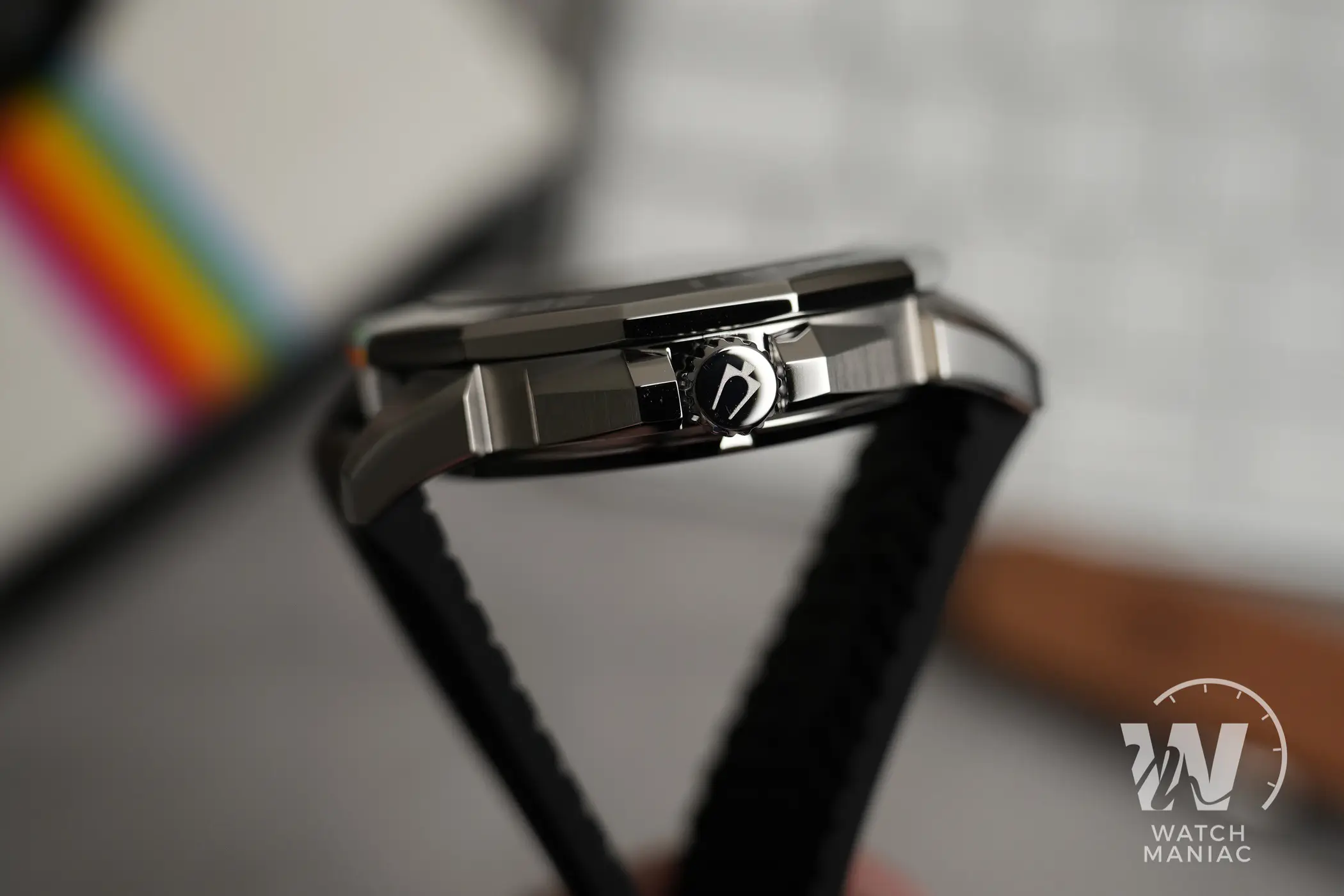 La cassa ha un design di gran carattere, a partire dalle anse che sui fianchi creano creano delle rientranze nei punti di raccordo con la carrure. Sono molto curvate verso il basso e hanno una finitura satinata sulla parte superiore e lucida sui biselli e ai lati. La sezione centrale della cassa ha invece una satinatura verticale molto ben realizzata. Lo stile angolare e spigoloso del Marine Star Ceramic culmina poi in corrispondenza della protezione per la corona, che ha un design elaborato e originale. Anche le finiture sono molto curate, con parti satinate, lucide e persino due piccole porzioni micropallinate.