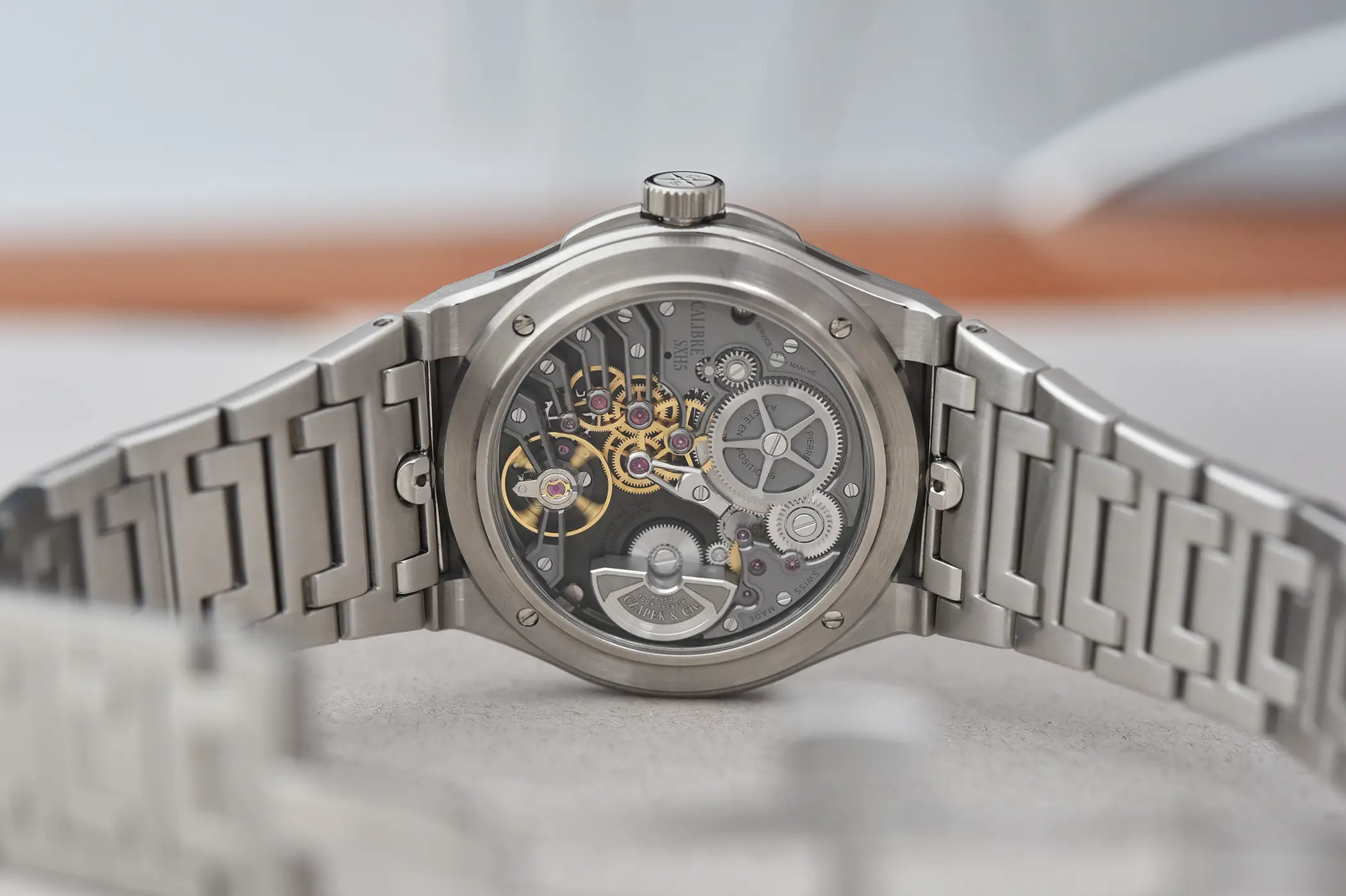 All’interno c’è il bellissimo calibro SXH5 di Czapek, progettato per rendere omaggio allo schema a ponti separati utilizzato da François Czapek nei suoi primi orologi da tasca. In questo modo è possibile ammirare tutti i ruotismi, resi ancora più evidenti grazie all’adozione di un microrotore realizzato in platino riciclato. In totale ci sono ben 193 componenti in uno spessore complessivo di 4,2mm. La frequenza è di 28.800a/h, e la riserva di carica è di circa 56 ore.