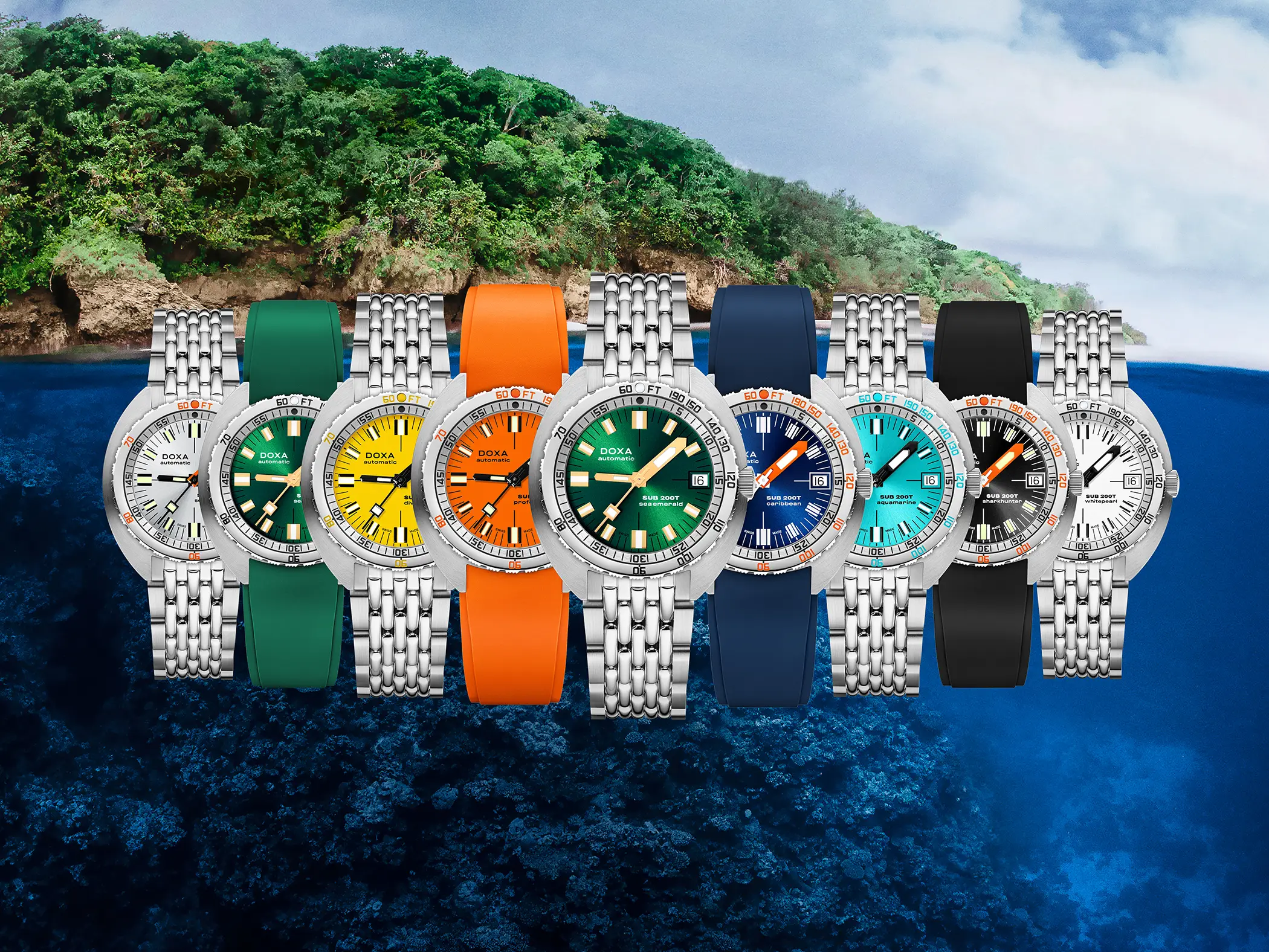 Doxa sembra provarci gusto a mettere in difficoltà gli eterni indecisi, ampliando di volta in volta le opzioni tra cui scegliere. Il SUB 200T è proposto in varie colorazioni e lavorazioni differenti. Restano i colori più iconici: Professional (arancione), Aquamarine (celeste/turchese), Sharkhunter (nero), Divingstar (giallo) e Caribbean (blu navy). Professional, Aquamarine, Sharkhunter, Divingstar e Caribbean sono acquistabili sia in versione opaca, detta Iconic, o nella variante Sunray con effetto soleil. Non mancano poi Whitepearl (bianco), disponibile solo nella versione opaca, e Searambler (argento) solo con quadrante Sunray.