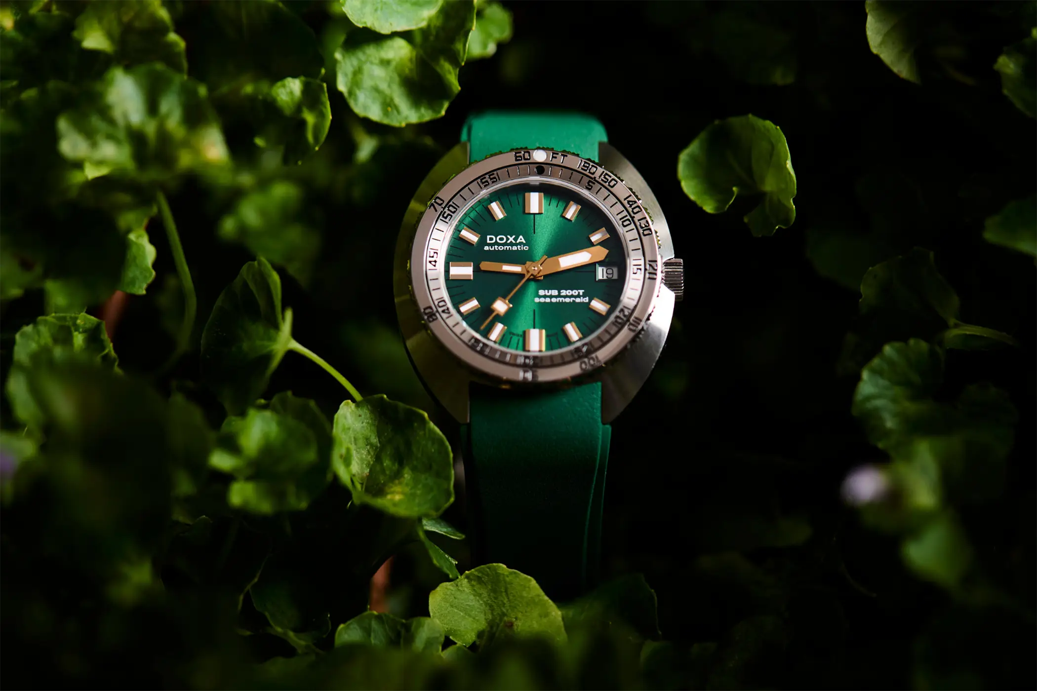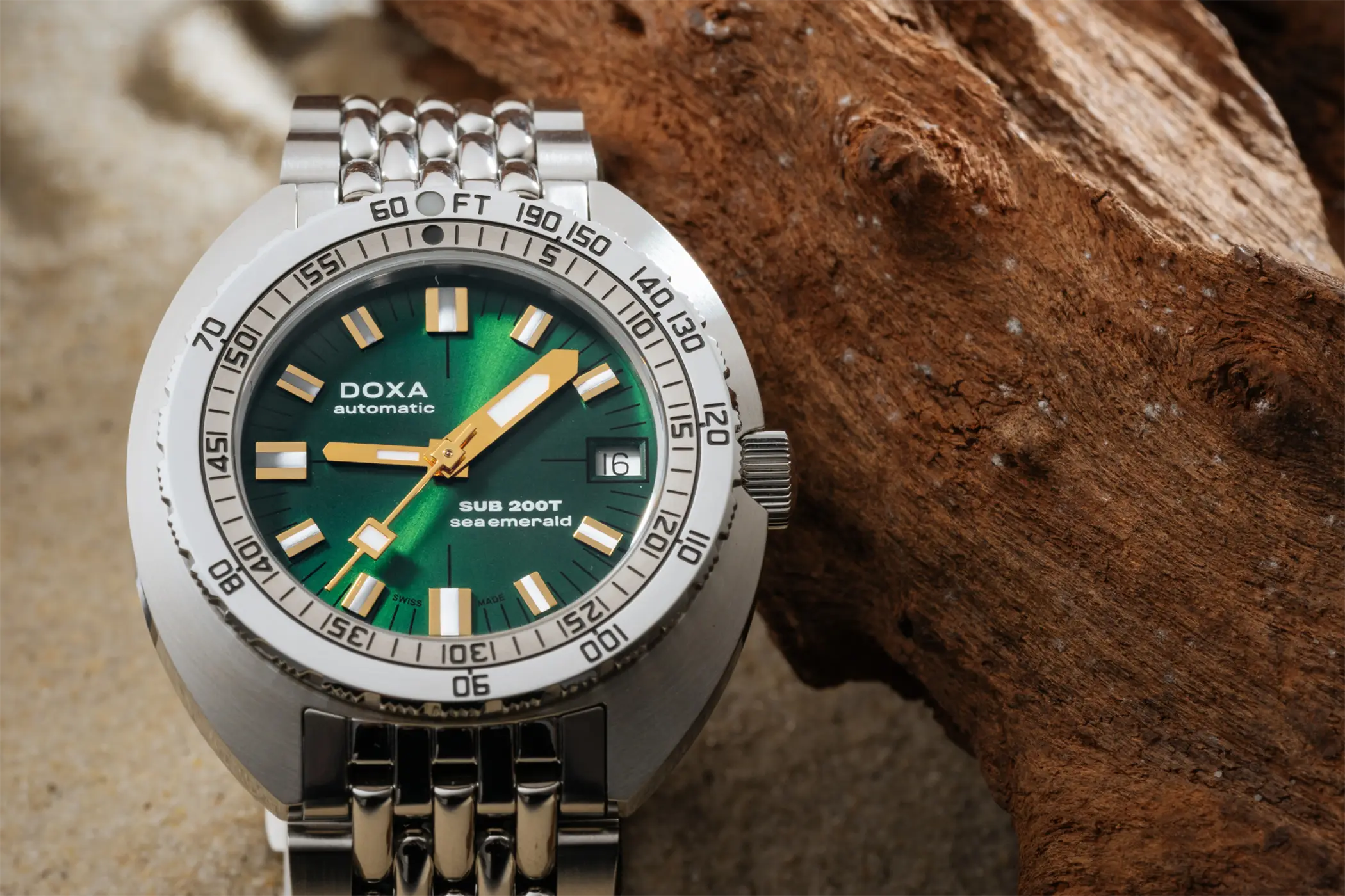 Con l’uscita del SUB200T Doxa lancia l’inedita colorazione Sea Emerald, proposta solo con lavorazione soleil. In questa versione le sfere e gli indici sono dorati e contrastano molto bene con il quadrante in tonalità verde smeraldo. L’abbinamento di colori non è certo una novità nel mondo dell’orologeria, ma ha permesso a Doxa di colmare una lacuna nel suo già ampio catalogo proponendo una versione dallo spirito sportivo e al contempo elegante. Non è così improbabile che in futuro questa variante cromatica venga proposta anche per gli altri mdoelli.