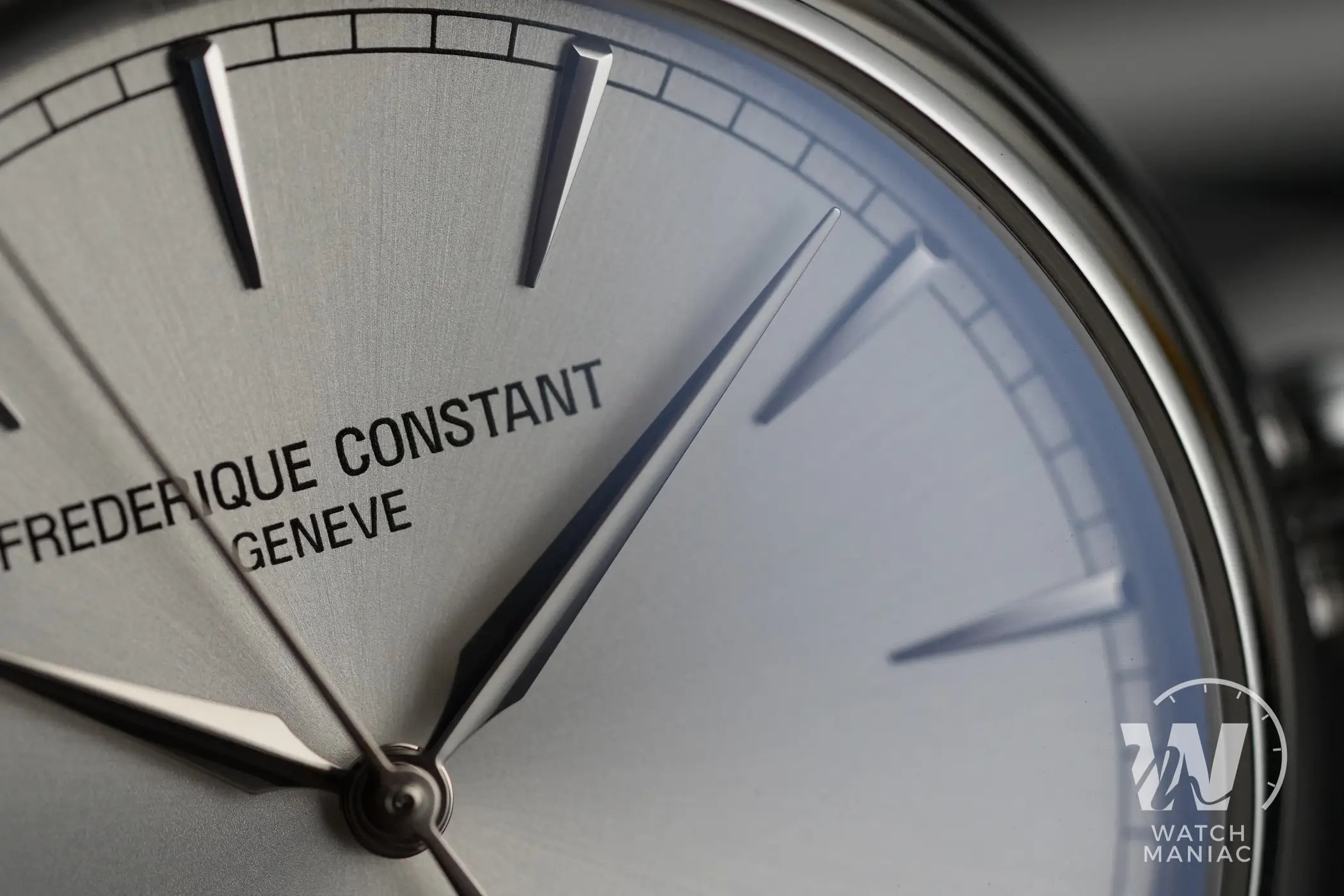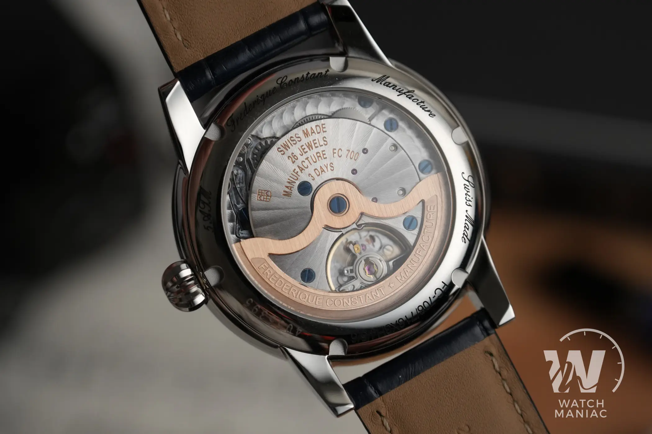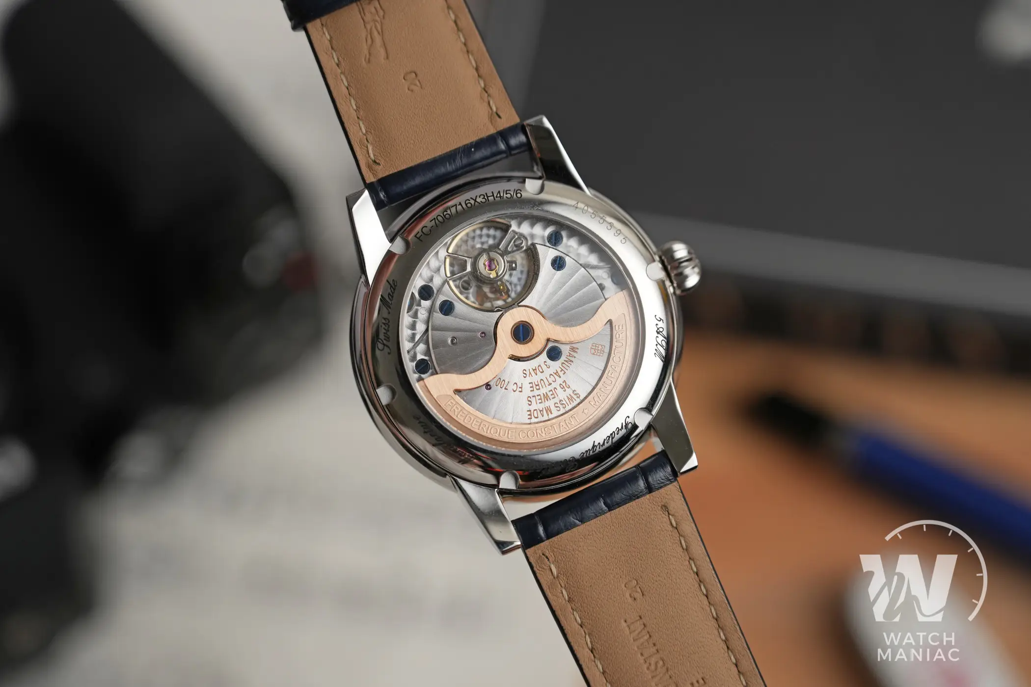 Il fondello è a vite, ma nonostante questo, come si può notare dalla scritta presente sulla cornice esterna, l’impermeabilità arriva solo fino a 5atm di pressione. Anche questa, comunque, è una specifica assolutamente in linea con la categoria dress watch a cui appartengono questi Frederique Constant.
