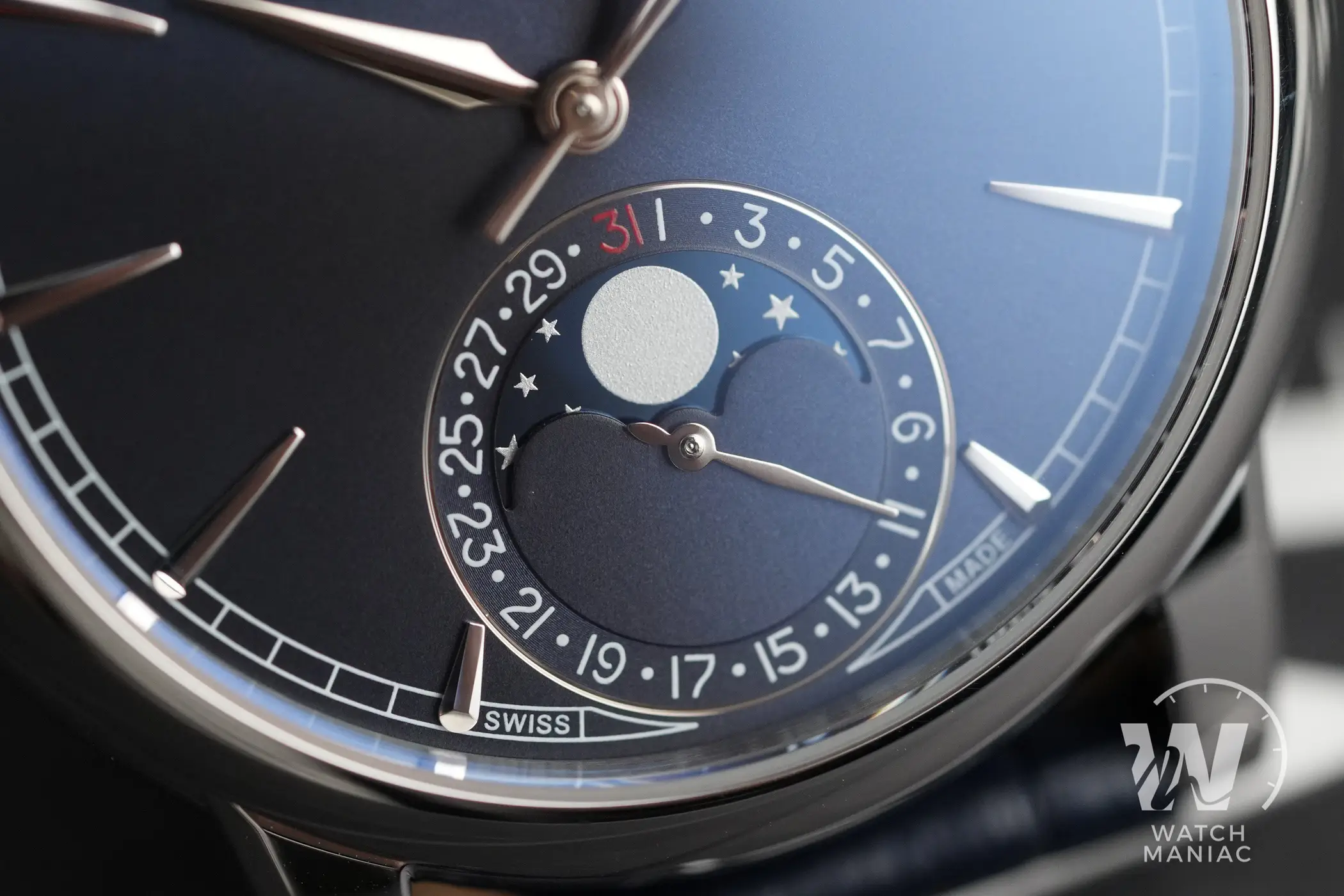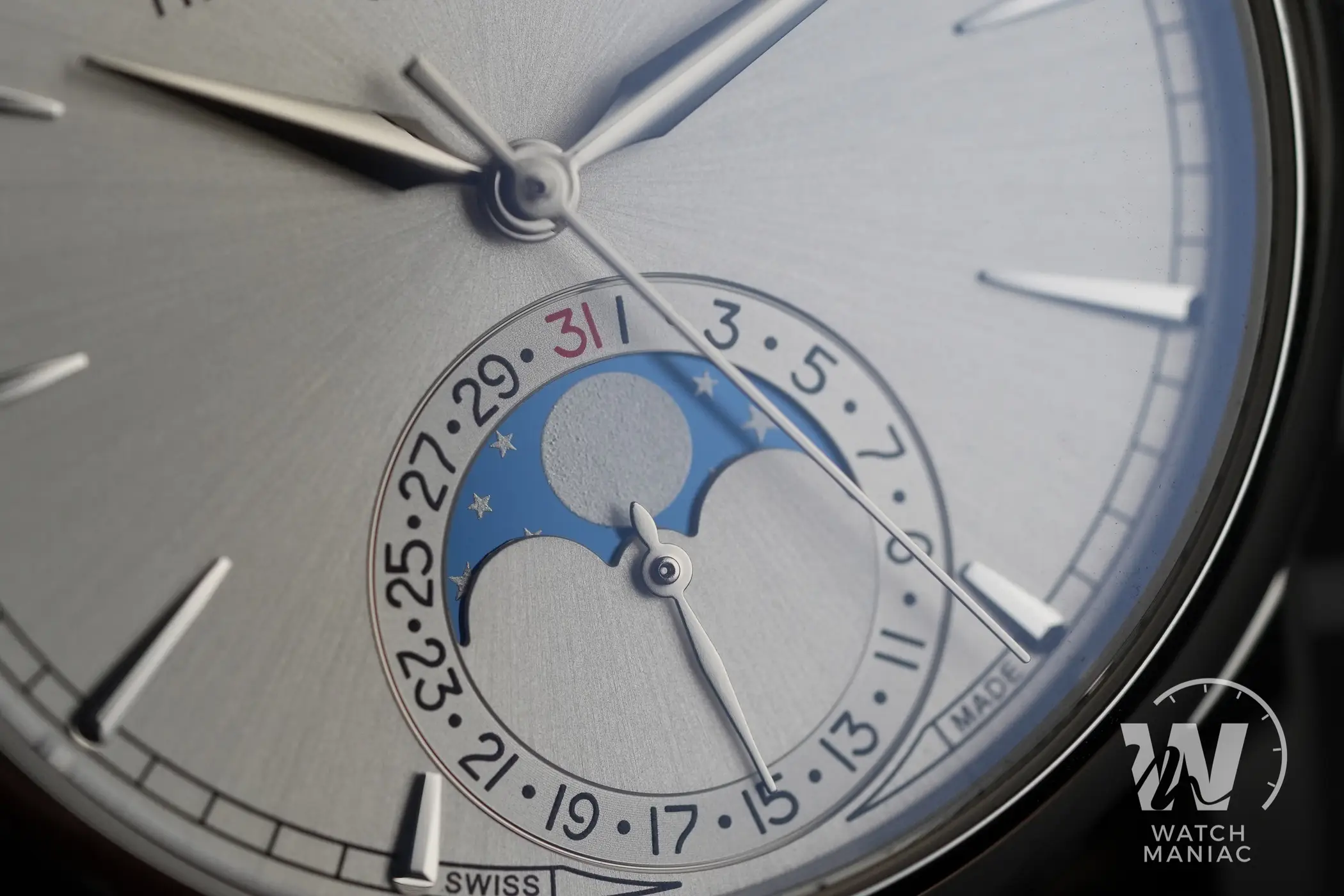 Il marchio è l’unica scritta stampata sul quadrante, che quindi rimane molto pulito e ordinato. Gran parte dello spazio è occupato dal sottoquadrante a ore 6 che raggruppa sia la funzione del datario che l’indicazione delle fasi lunari. Di solito con i datari di questo tipo il corpo scelto per i giorni del mese tende ad essere un po’ piccolo e quindi poco visibile, ma qui non ho riscontrato questo problema. Spiccano il numero 31 evidenziato in rosso e il disco delle fasi lunari, che con la sua colorazione blu scura risalta maggiormente nella referenza argentata.
