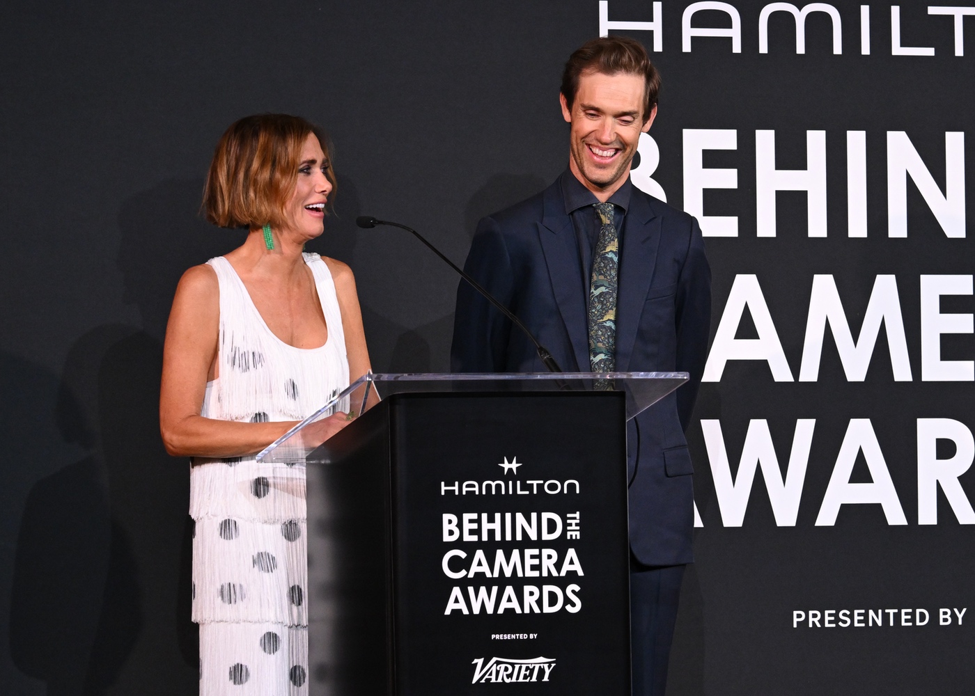 Kristen Wiig, Sean Douglas receive the Hamilton Behind the Camera Award for original song for “Will and Harper” at the Hamilton Behind the Camera Awards presented by Variety held at the Hollywood Athletic Club on November 14, 2024 in Los Angeles, California.