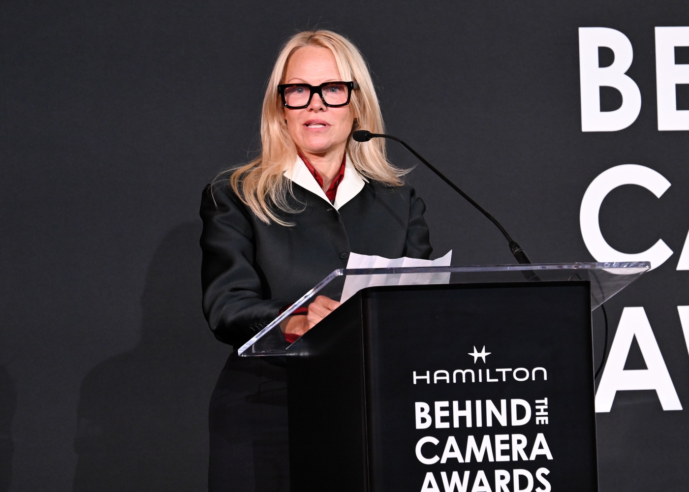 Pamela Anderson presents the Hamilton Behind the Camera Award for directing for “The Last Showgirl” at the Hamilton Behind the Camera Awards presented by Variety held at the Hollywood Athletic Club on November 14, 2024 in Los Angeles, California.