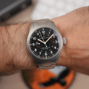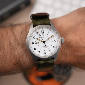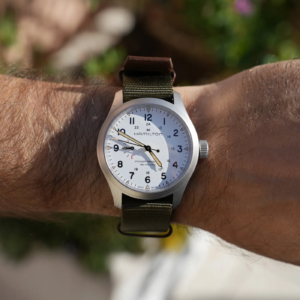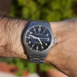 Il vetro è uno zaffiro lievemente convesso con trattamento antiriflesso sul lato interno. Questo è molto efficace e garantisce ottimi risultati, soprattutto se abbinato con il quadrante bianco. La cassa mantiene un design piuttosto classico per Hamilton. Qui però, rispetto alle anse più lunghe e spigolose dei Khaki Field Mechanical, abbiamo a che fare con quelle più arrotondate del Murph o dei Khaki Field Auto, che personalmente preferisco. La finitura superficiale è micropallinata, una scelta che in ambito militare era preferibile per ridurre la lucentezza dell’acciaio e per evitare bagliori indesiderati in combattimento, ma in ambito urbano garantisce una buona resistenza ai graffi ed è molto piacevole al tatto. Lo spessore è leggermente superiore sia rispetto ai Mechanical che rispetto agli automatici, ma rimane comunque ben proporzionato con il diametro dell’orologio.