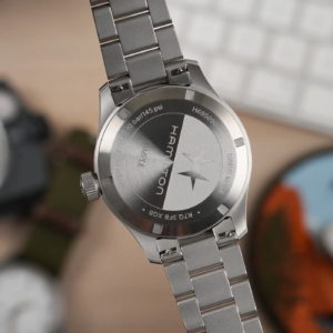 Il fondello a vite in acciaio ha una decorazione semplice ma ben realizzata, con il medaglione al centro diviso in due semicerchi che riportano il logo e il marchio di Hamilton. Tra le varie specifiche incise sulla parte più esterna c’è anche il dato sull’impermeabilità fino a 10bar, in linea con alcune ultime referenze della linea Khaki Field e un bel passo avanti rispetto ai 5bar dei Khaki Field Mechanical.