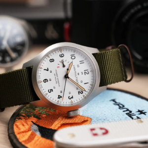Per entrambe le colorazioni la finitura del quadrante è opaca, in perfetto stile field watch. L’impostazione generale della grafica rimane quella classica per Hamilton, con indici a numeri arabi dalla leggibilità impareggiabile grazie al massimo contrasto garantito dall’accostamento tra nero e bianco, indipendentemente dalla variante scelta. Come su tante altre referenze Khaki Field, anche qui sono riportate in piccolo all’interno le ore pomeridiane, mentre all’esterno ci sono dei piccoli triangoli realizzati in SuperLuminova “old radium”.