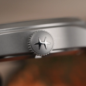 La corona a ore tre, micropallinata e con in rilievo il logo lucido di Hamilton, è ben dimensionata per essere facilmente azionata durante la ricarica manuale ma non sporge troppo dalla carrure.