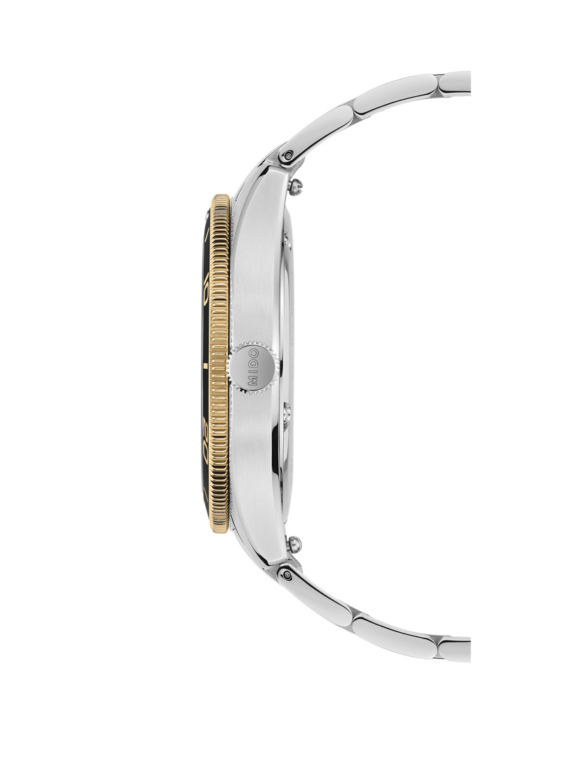 Nonostante le caratteristiche tecniche di tutto rispetto, sono le scelte stilistiche di MIDO a rapire lo sguardo. Il quadrante ha un originale motivo ondulato in rilievo a richiamare le onde marine. Gli indici applicati sono rotondi e di dimensioni generose per garantire una leggibilità ottimale. Su di essi, come sulle sfere di ore e minuti, trova spazio una buona dose di Superluminova, che consente la lettura dell’ora anche al buio.