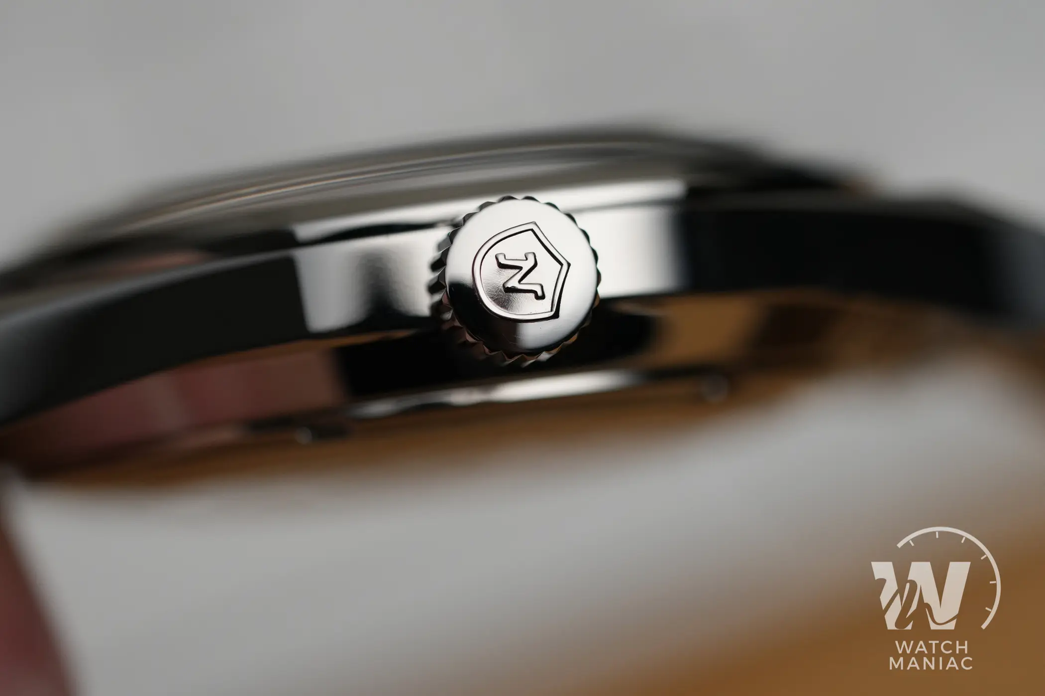 Il fondello a vite riporta nel medaglione al centro il logo di Nivada in rilievo accompagnato dal nome del modello. Non è un decorazione particolarmente elaborata, ma è comunque gradevole e ben realizzata. Tra le varie informazioni incise è presente anche il dato sull’impermeabilità fino a 10atm di pressione, una specifica che, unita alla corona a vite, rende l’F77 un orologio molto versatile.