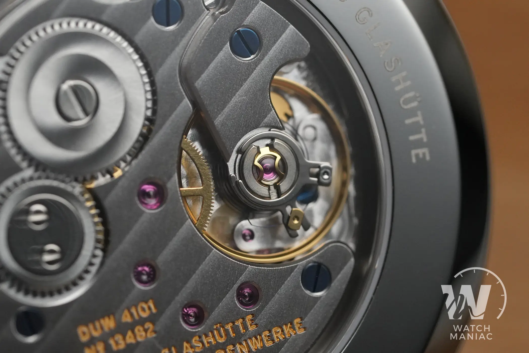 Il cuore di questi Tangente è il calibro DUW 4101 a carica manuale. Si tratta di una meccanica realizzata in totale indipendenza da parte di Nomos, incluso anche lo scappamento proprietario del marchio, il Nomos Swing System, riconoscibile dalla spirale in colorazione blu. È presente la complicazione della data, la frequenza è di 21.600a/h e la riserva di carica è di 42 ore. Nonostante non siano certificati, questi calibri vengono comunque regolati secondo i paramenti di cronometro e il livello di finitura e delle lavorazioni è ciò che rende davvero speciale questa manifattura tedesca, soprattutto se si tiene conto della fascia di prezzo di questi prodotti. Si trova un po’ tutto il repertorio tipico, con costolatura di Glashütte sui ponti, perlage sulla platina, un accenno di anglage e viti temperate blu. E poi c’è l’inconfondibile ruota con la lavorazione a raggi di sole.