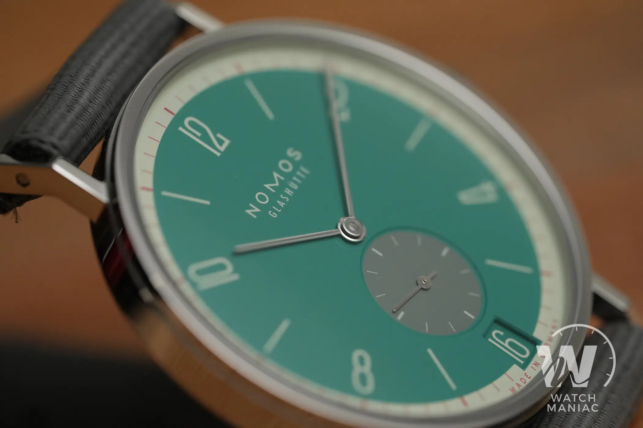 Questa non è un’operazione del tutto inedita per Nomos dato che nel 2004 presentò i Super 30, ma in quel caso si trattava appunto di 30 varianti in edizione limitata. Stavolta le configurazioni salgono a 31, tutte basate sul Tangente con datario, e con accostamenti cromatici diversissimi tra loro. Si va da quelli più classici e sobri ad altri decisamente particolari e vistosi, ma con una varietà simile è davvero difficile non trovare almeno 3-4 referenze di proprio gusto. In questa recensione vedrete la variante Schlossgrün, con il verde come colore predominante, la referenza Chili, con quadrante cremisi molto brillante e audace, e poi la versione Peace, un nome utilizzato da Nomos per sottolineare la coesistenza pacifica di blu e rosso sullo stesso quadrante.